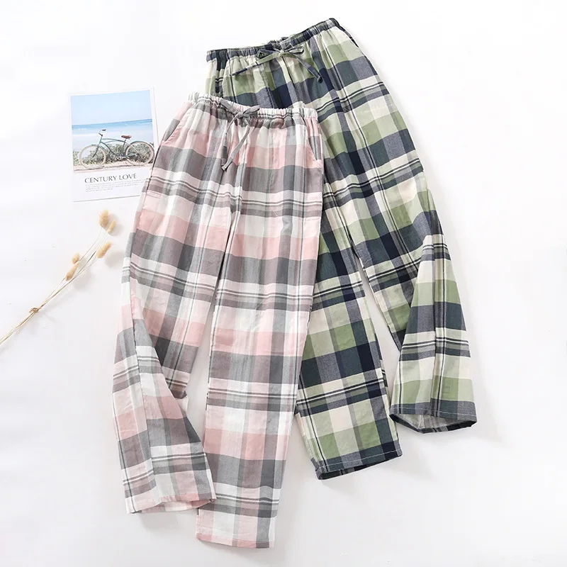 Весенние парные хлопковые марлевые клетчатые штаны для сна, женские...