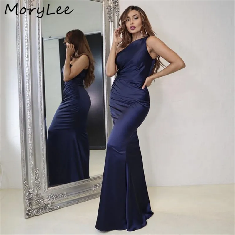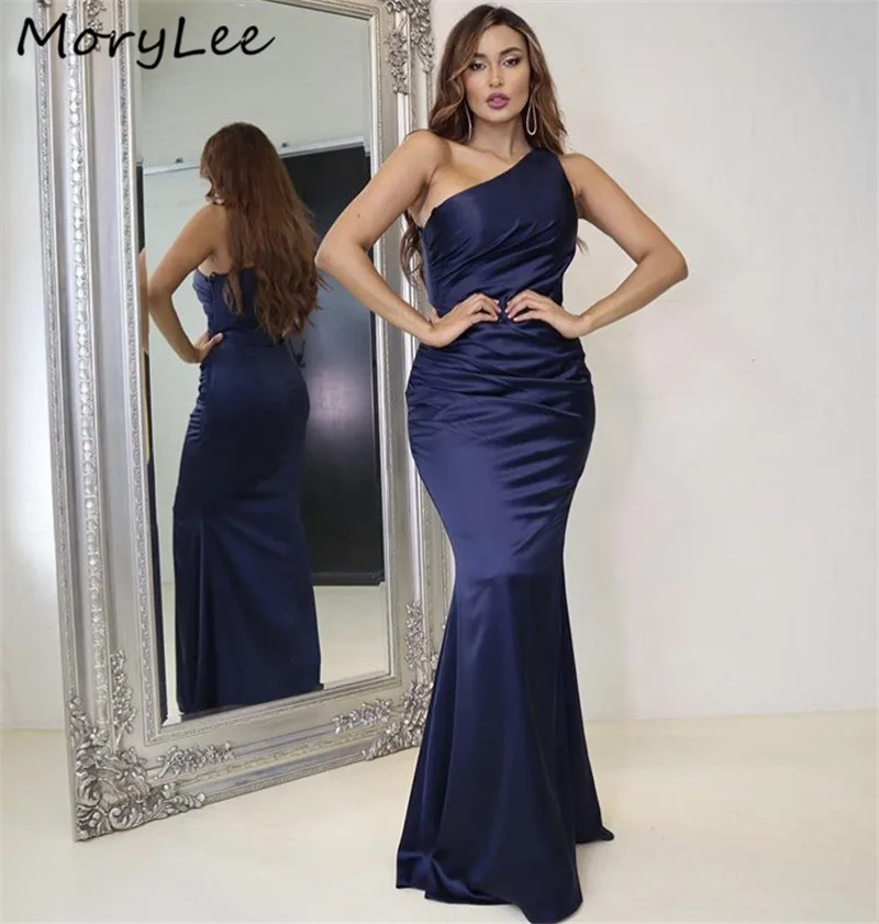 Темно-синие вечерние платья длиной до пола на одно плечо, шелковые атласные вечерние платья-русалки с молнией на спине, Платья для вечеринок