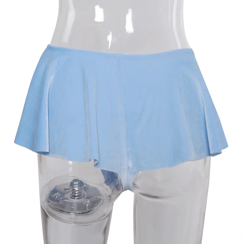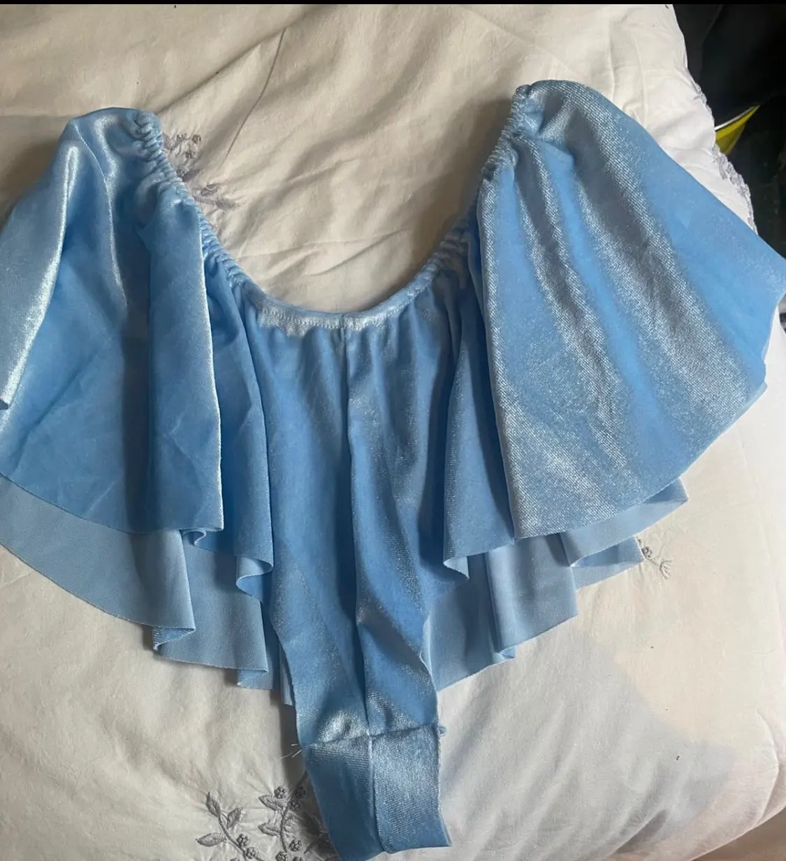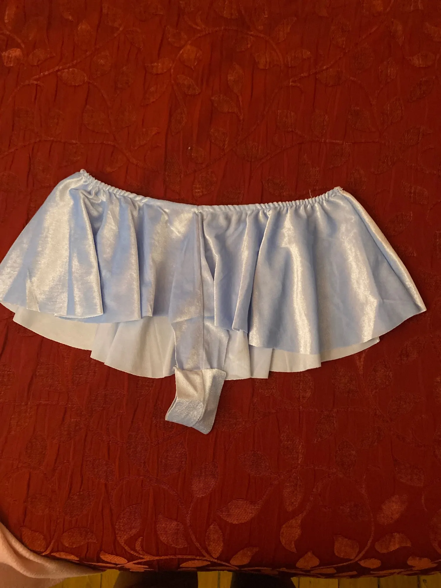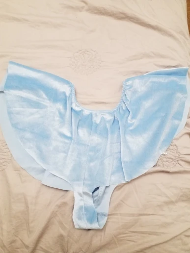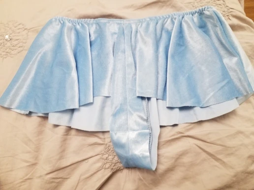 Очень красивая юбка-трусики из синей ткани и Серебристые блики. Синтетический материал хорошего качества. Очень мило. Он хорошо подтягивает талию, очень короткий, легкий, и оставляет ягодицы голыми. Шорты средней длины почти не скрывают секс. Эффект галлюцинации! Мне нравится.