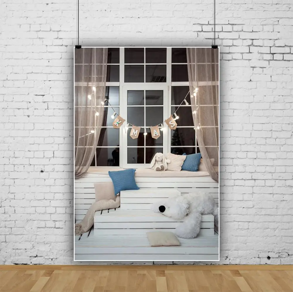 Laeacco серая деревянная полка, плюшевый мишка, окно, занавеска, подушка, веселая Рождественская вечеринка, детский портрет, Фотофон, Фотофон