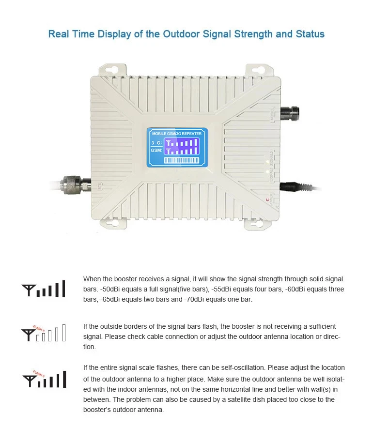1. Получает сигнал Мощная антенна достигает доступа к хорошему сигналу и доставляет его к бустеру. 2. Повышает сигнал Усилитель получает сигнал, усиливает его и служит в качестве реле между вашим телефоном и ближайшей башней сотовой связи. 3. Сигнал передачи Ваши устройства получают увеличенный прием ячеек, а звонки и данные подаются через усилитель обратно в сеть. Примечание: Пожалуйста, убедитесь, что место, где вы собираетесь установить WCDMA 3G. И убедитесь, что вы можете получить по крайней мере 2 бар 3G сигнал на открытом воздухе перед покупкой, в противном случае этот продукт не может вам помочь. Для улучшения сигнала в помещении необходим хороший внешний сигнал.