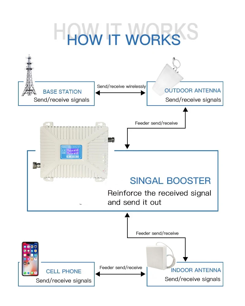 1. Принимает сигнал Мощная антенна достигает доступа к хорошему сигналу и доставляет его к бустеру. 2. Усиливает сигнал Усилитель получает сигнал, усиливает его и служит в качестве реле между вашим телефоном и ближайшей башней сотовой связи. 3. Передачи сигнала Ваши устройства получают увеличенный прием ячеек, а звонки и данные подаются через усилитель обратно в сеть. Примечание: Пожалуйста, убедитесь, что место, где вы собираетесь установить WCDMA 3G. И убедитесь, что вы можете получить по крайней мере 2 бар 3G сигнал на открытом воздухе перед покупкой, в противном случае этот продукт не может вам помочь. Для улучшения сигнала в помещении необходим хороший внешний сигнал.