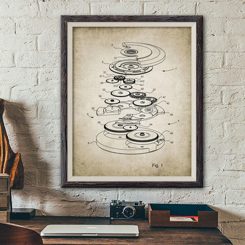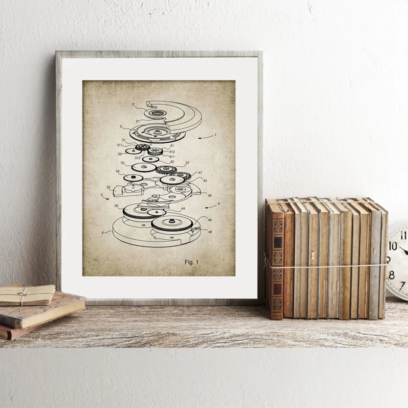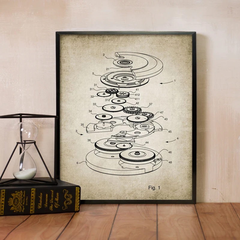 Часы с автоподзаводом, схематические принты, дизайн часов, патент, винтажные часы-постер, подарок, часы, искусство, холст, живопись, картина, Декор