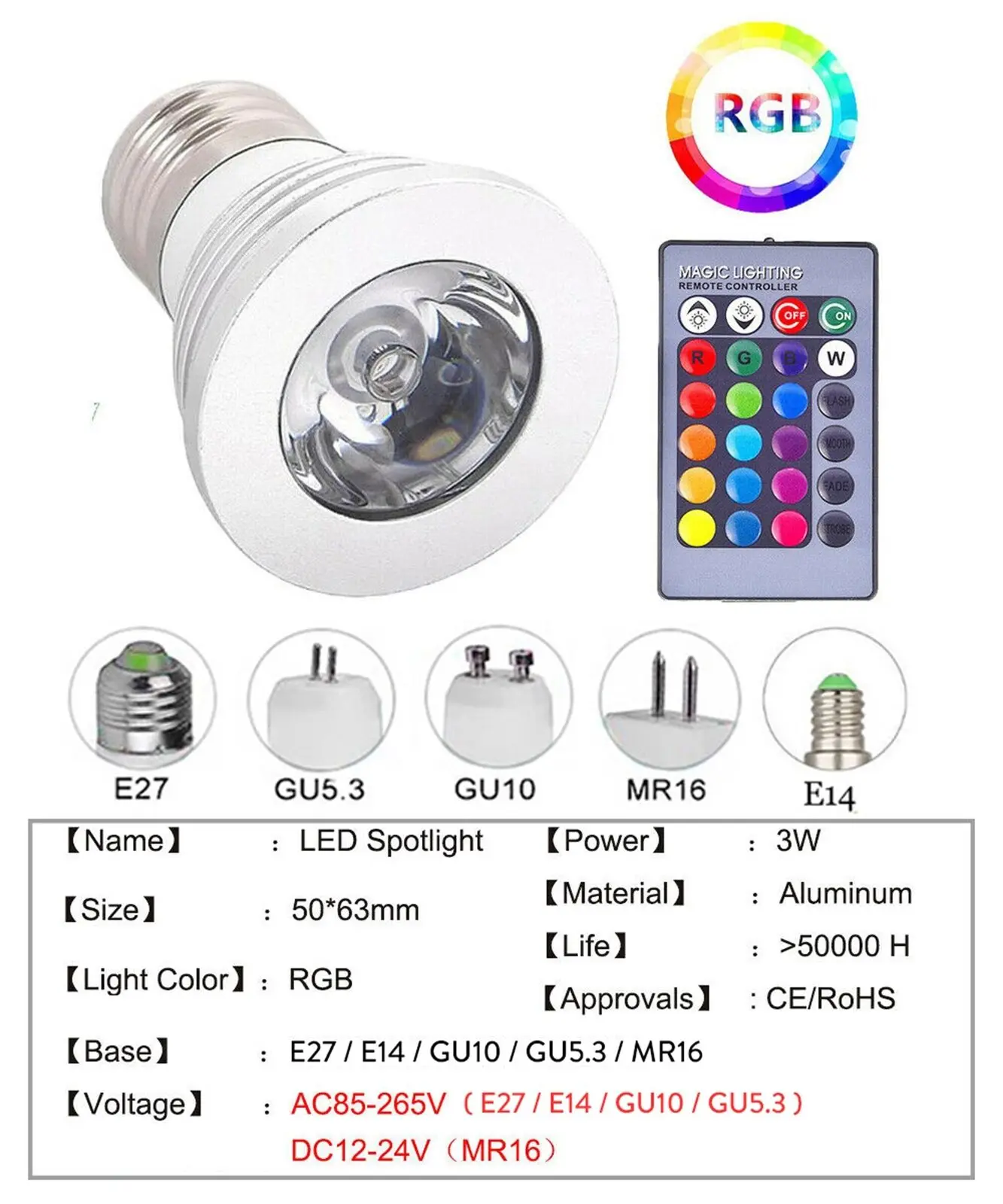 E27 E14 GU10 GU5.3 MR16 RGB светодиодный светильник, лампа, 3 Вт, диммируемая, светодиодный, gu10, 220 В, 110 В, 12 В, сценический светильник + 24-клавишный пульт дистанционного управления