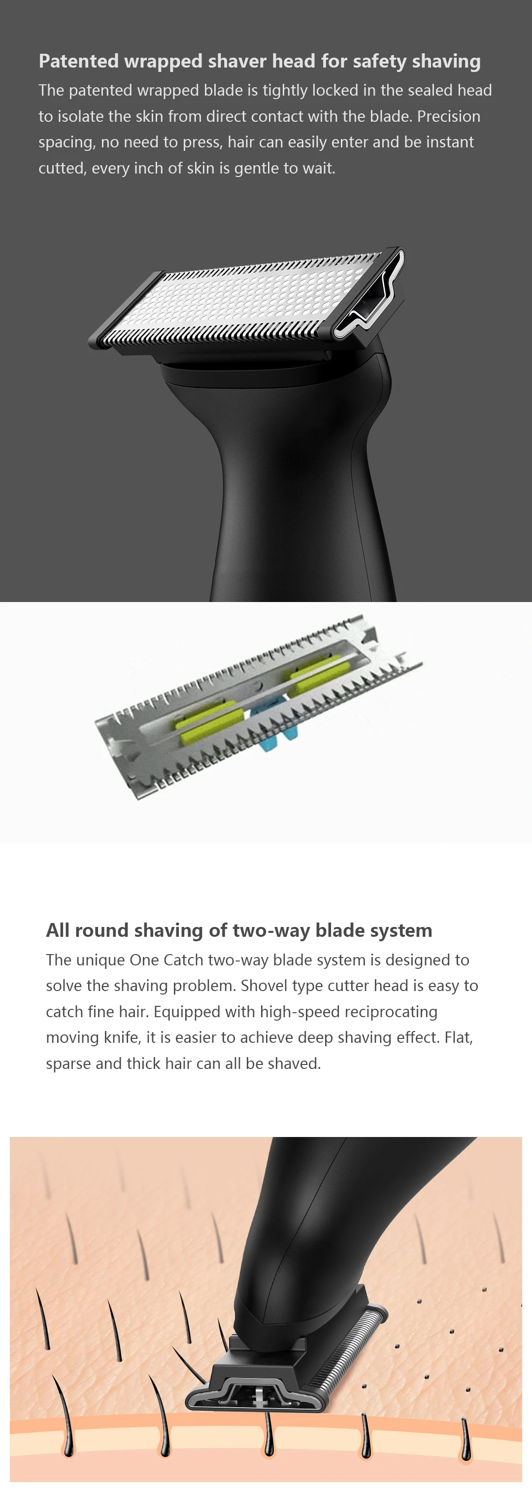 -Запатентованная головка бритвы для безопасного бритья. Запатентованное лезвие плотно фиксируется в герметичной головке, чтобы изолировать кожу от прямого контакта с лезвием.-Круглое бритье системы двусторонних лезвий. Уникальная система двусторонних лезвий с одним захватом предназначена для решения проблемы бритья. Оснащенный высокоскоростным сабельным движущимся ножом, легче добиться эффекта глубокого бритья.-Гибкая головка бритвы с гибким лезвием в сочетании с гладкой сеткой для лезвий, легко Сбривает волосы по контуру лица щек, подбородка, висков и лба.-Многоцелевое бритье всего тела не только для бритья, но и для укладки. Волосы на подмышках и ногах легко сбриваются, линия бикини для бровей укладывается по желанию.-Водонепроницаемое, сухое и влажное бритье IPX5 нанесите нежную пену на кожу, головка бритвы будет плавно скользить по коже, и будет сбрита даже непобедимая нижняя челюсть.-Высокоскоростной двигатель со встроенным высокоскоростным двигателем 6000 об/мин, мощным способом, более высокой эффективностью бритья и эффективно снижает вероятность блокировки волос.-Длительный срок службы встроенного NiMH аккумулятора, зарядного порта USB Type-C, полного электричества может длиться 50 дней.