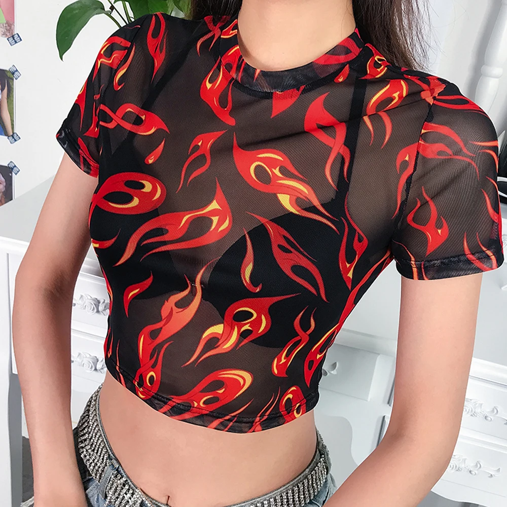 Женский укороченный топ с принтом Angel Flame, прозрачная Сетчатая ...