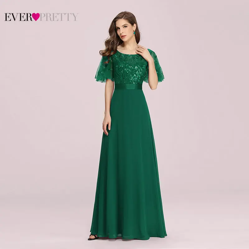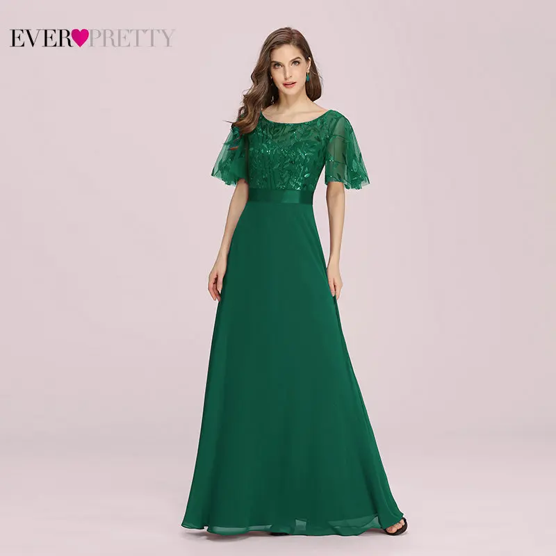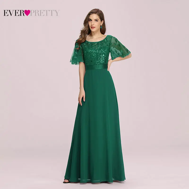 Элегантное темно-зеленое платье на выпускной платье размера плюс Ever Pretty, новое ТРАПЕЦИЕВИДНОЕ ПЛАТЬЕ с круглым вырезом и расклешенными рукавами, кружевное вечернее платье с блестками, EP00691DG