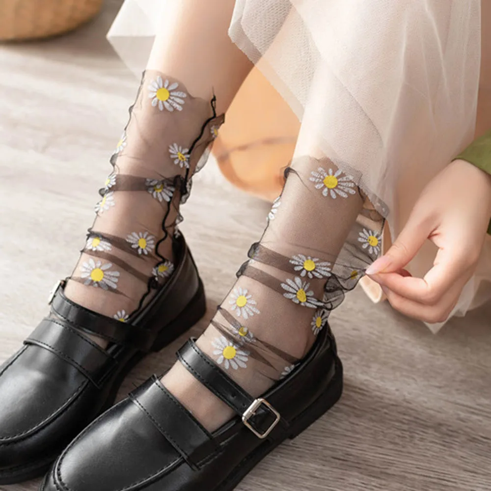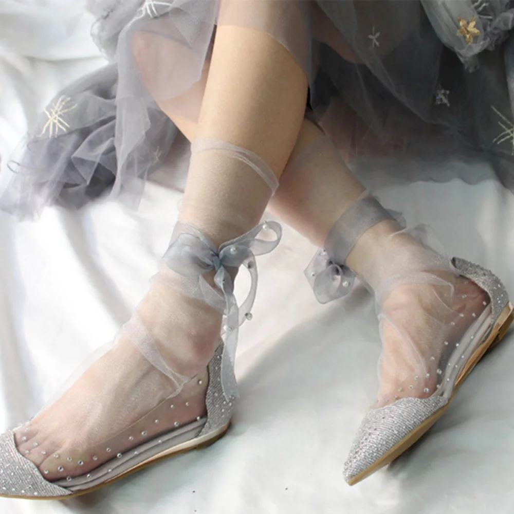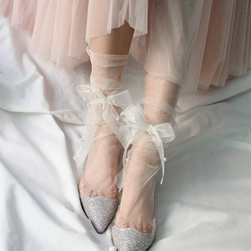 Носки женские, летние, ультратонкие, из тюля, прозрачные, с жемчугом