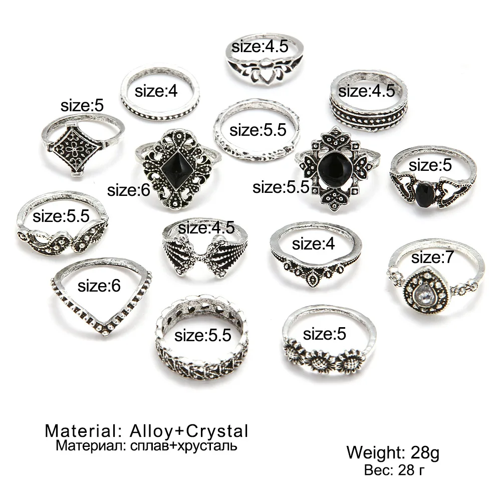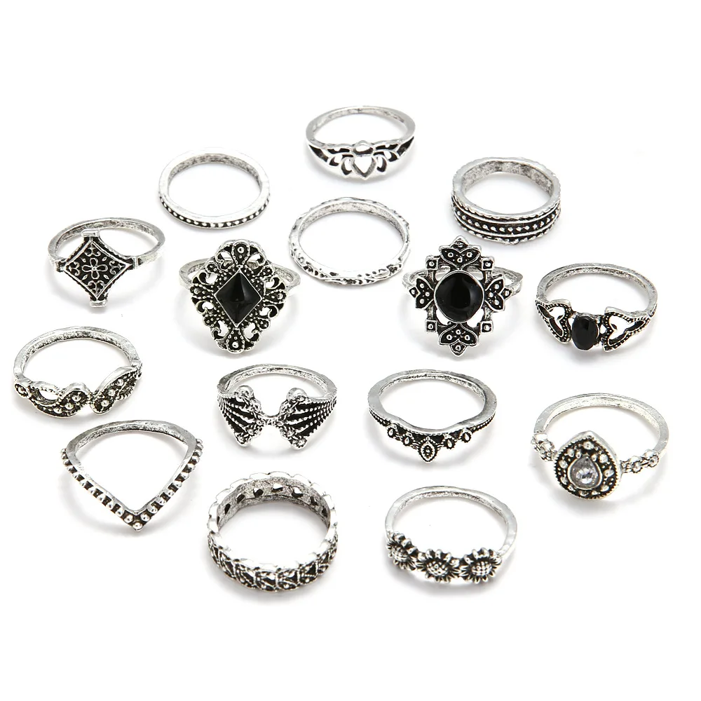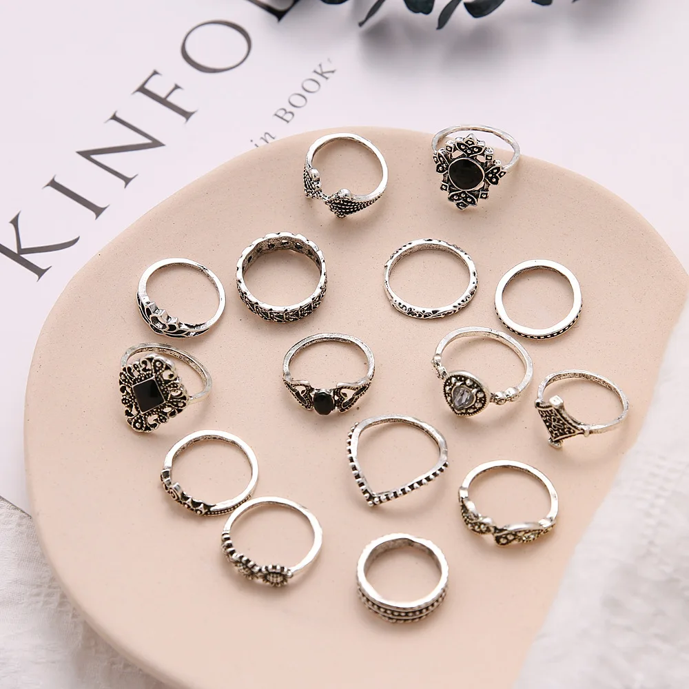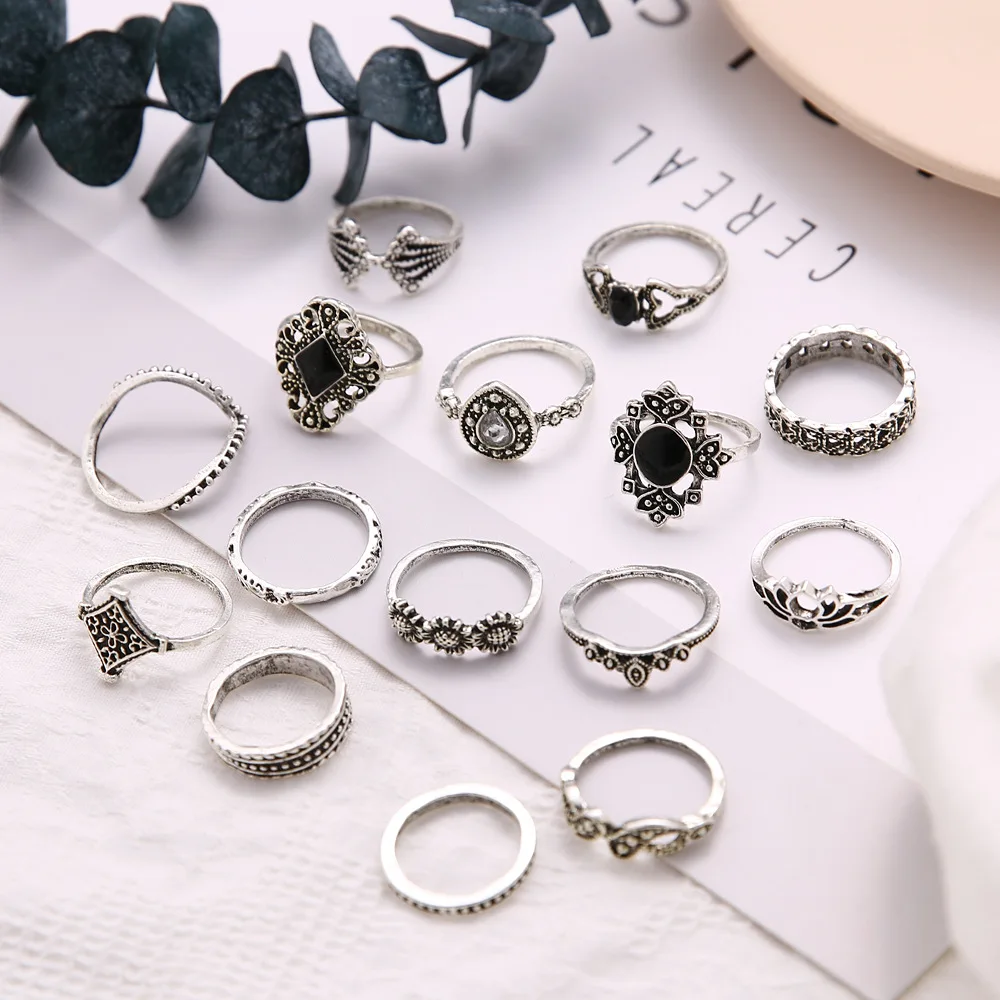 Комплект колец с полым лотосом, подсолнухом, 15 шт., геометрический черный кристалл, Модный женский комплект, оптовая продажа