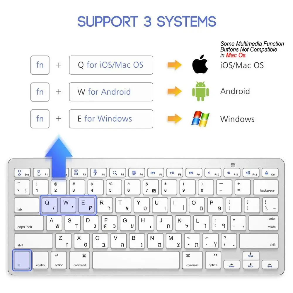 Ультратонкая беспроводная клавиатура с поддержкой Bluetooth и иврита, с низким уровнем шума, совместима с iOS, iPad, Android, планшетами и Windows