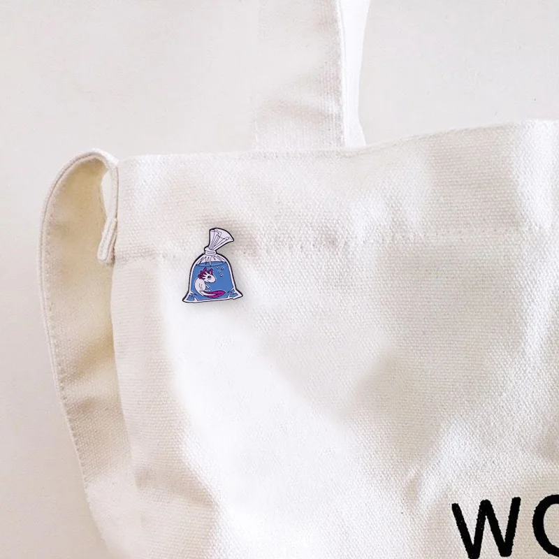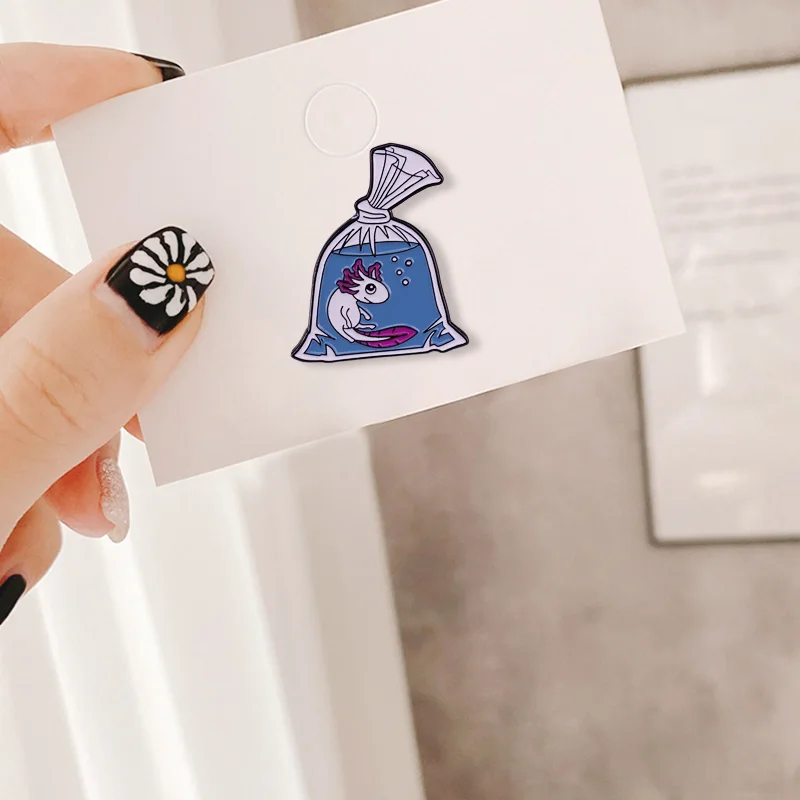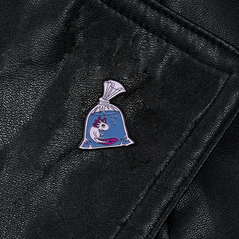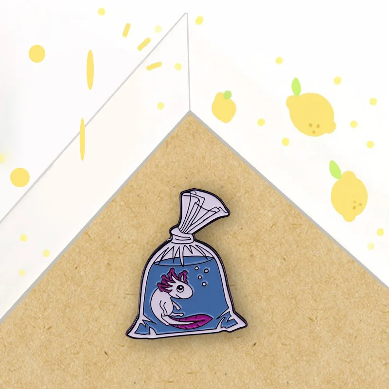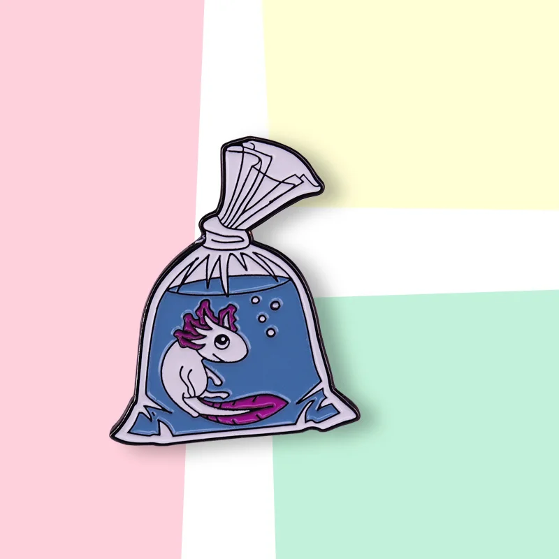 Этот красивый жесткий эмалированный штифт изображает небольшую аксолотль в пакете, заполненном водой