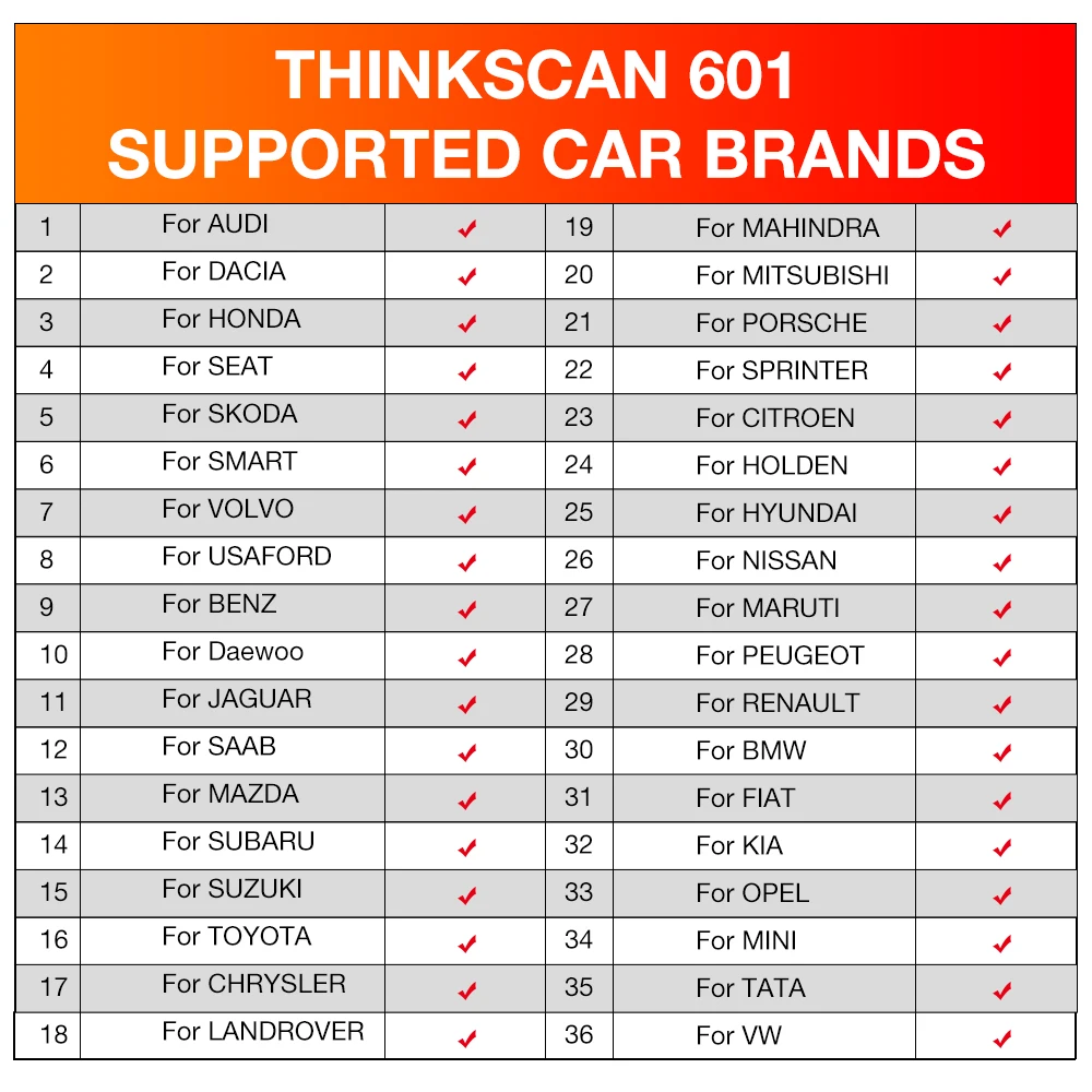 THINKSCAN 601 Автомобильный сканер список поддерживаемых автомобилей: