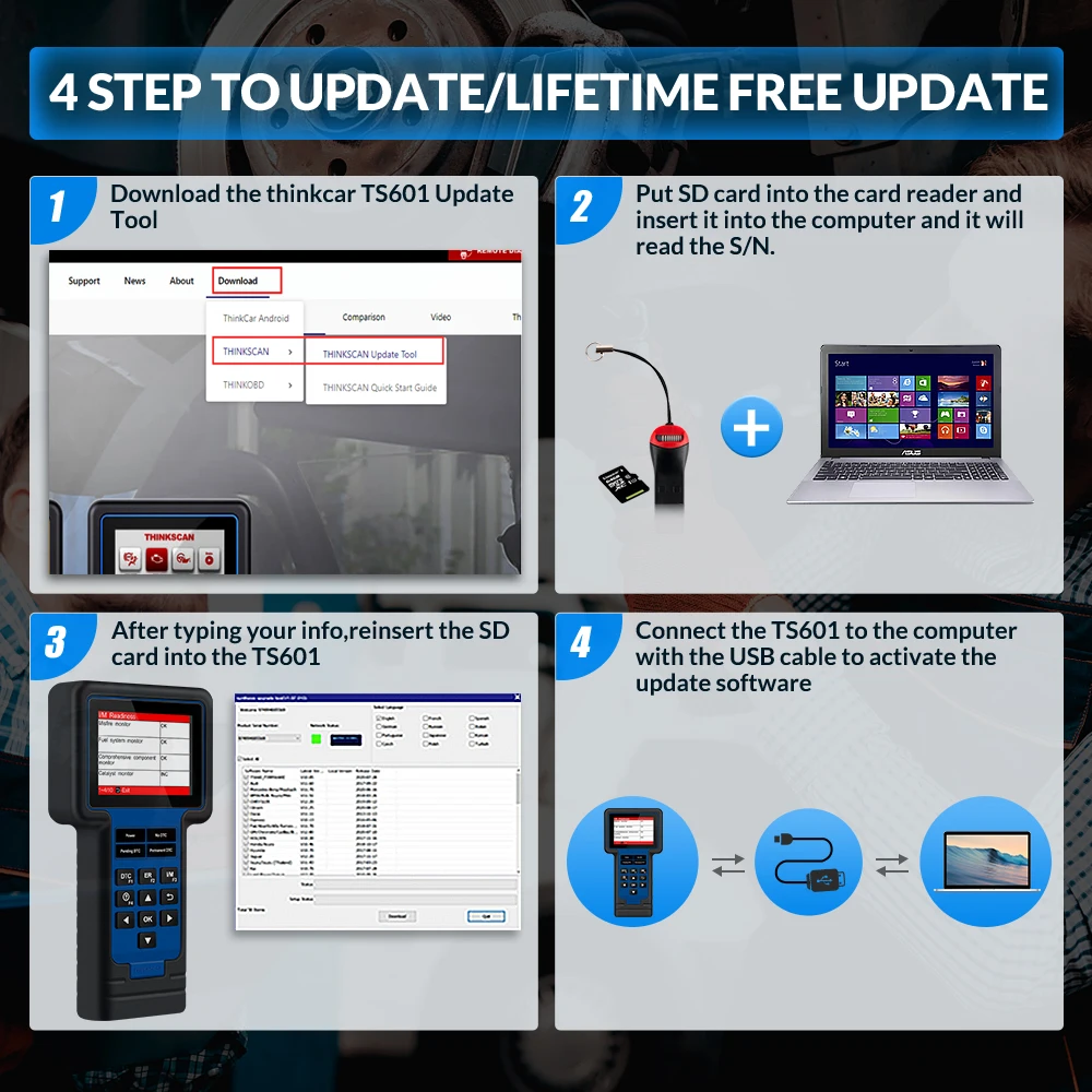 Шаг 1: Подключите сканер к ПК с помощью кабеля типа C. Войдите в меню устройства «Справка-информация об инструменте» и сделайте фотографию для записи отображаемой информации.Шаг 2: Загрузите программное обеспечение обновления с веб-сайта офиса на компьютере.Шаг 3: нажмите «Обновить Инструмент Setup.exe» и следуйте сообщению, чтобы установить клиентское программное обеспечение на компьютере.Шаг 4: вставьте tf-карту в кард-ридер и вставьте кард-ридер в порт вашего ПК. Он автоматически прочтет Товар «серийный номер».Шаг 5: нажмите «Обновление устройства», чтобы войти на страницу регистрации, введите информацию о своей электронной почте, проверьте «код регистра» на фотографии, которую вы сделали раньше.Шаг 6: очень важно! После обновления на компьютере вставьте tf-карту в сканер, затем используйте кабель type c для зарядки некоторое время. Теперь обновление завершено.Необходимые условия:1. Перейдите на http://www.mythinkcar.com, чтобы загрузить инструмент обновления и установить его на компьютер.2. Системные требования: Windows XP, 7, 8 или Windows 10.