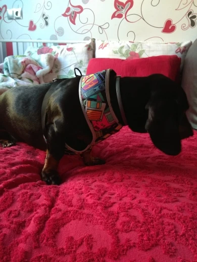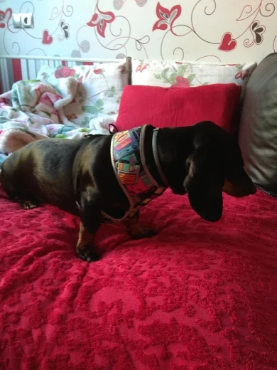 На таксу весом в 9,5 кг. размер в размер. Качество неплохое.