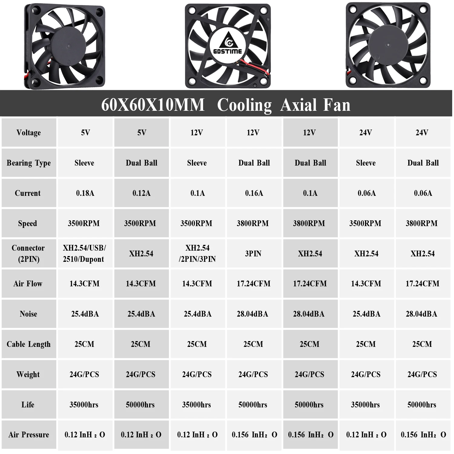 Кулер Gdstime для процессора ПК, 2 шт., 60 мм, 5 В, 12 В, 24 В, вольт, 6 см, 60x60x10 мм, вентилятор охлаждения 6010 для компьютера, ПК, 2PIN, 3PIN, бесщеточный вентилятор