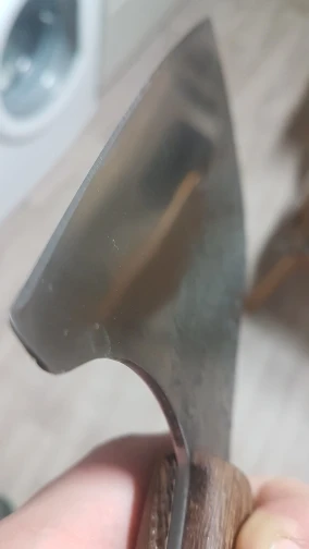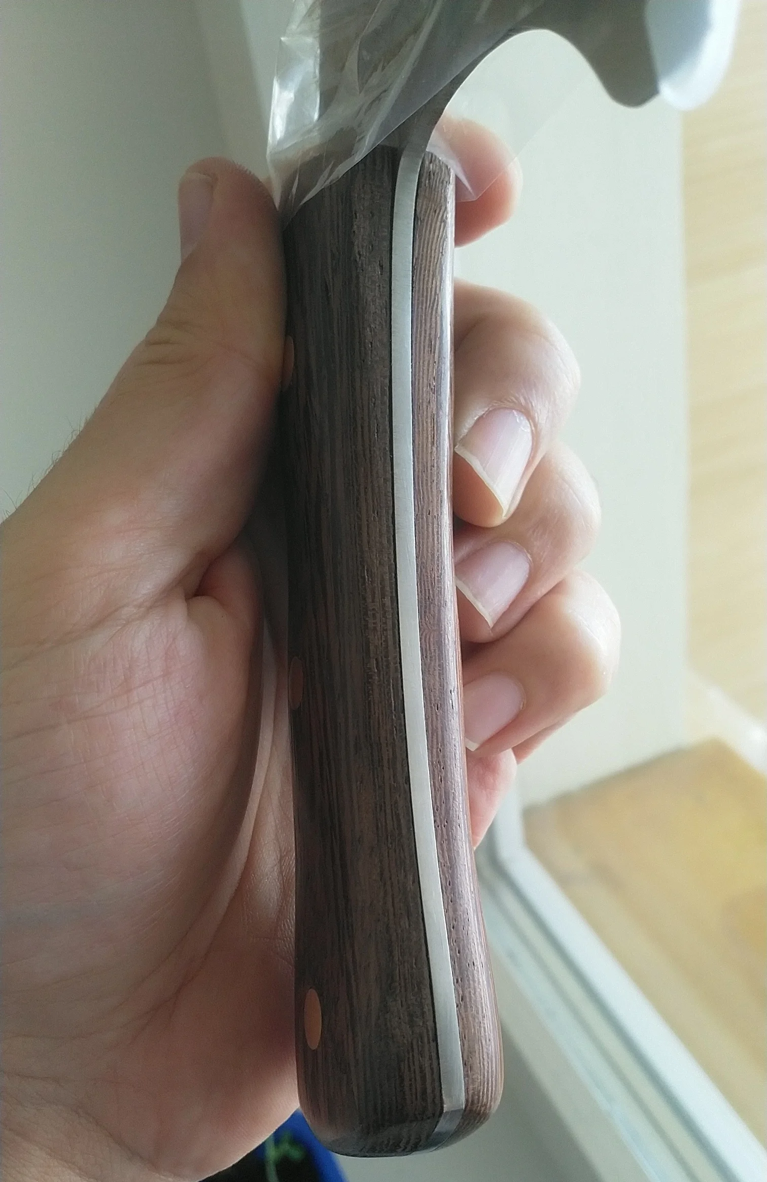 Получил нож, в живую такой же как и на фото. На вес не сильно тяжелый, работать комфортно им. Обух утолщается к верху, т.е. при разделке мяса, больших кусков, нож сам будет на 2 части раскидывать мясо. В целом понравился, с завода заточен остро.