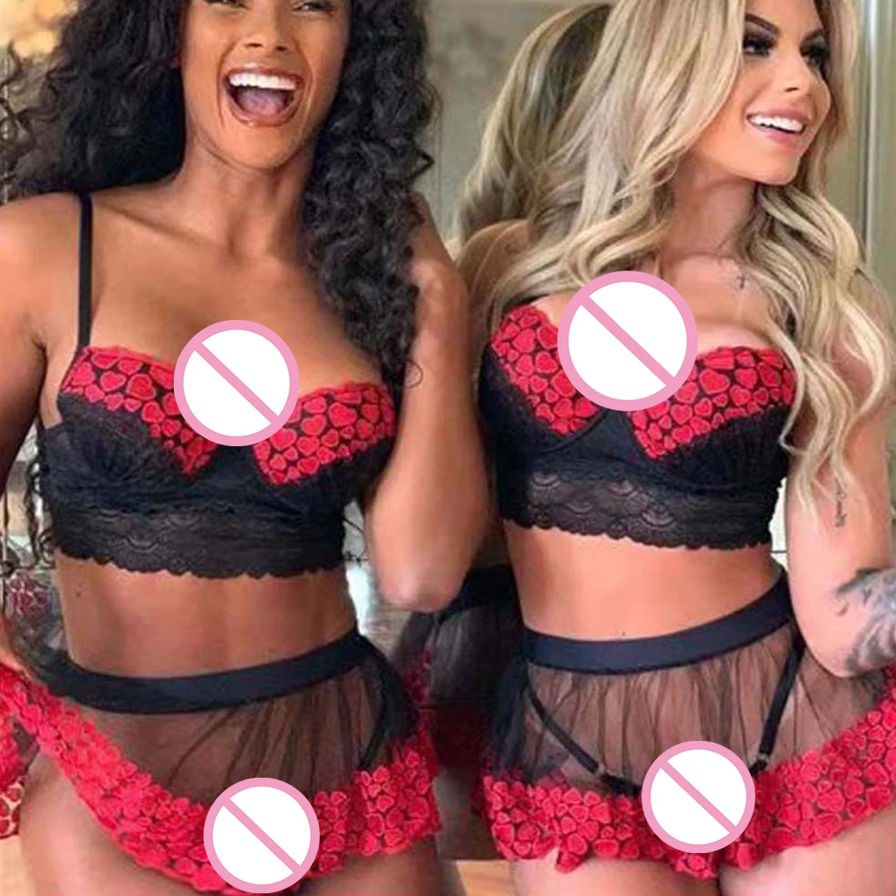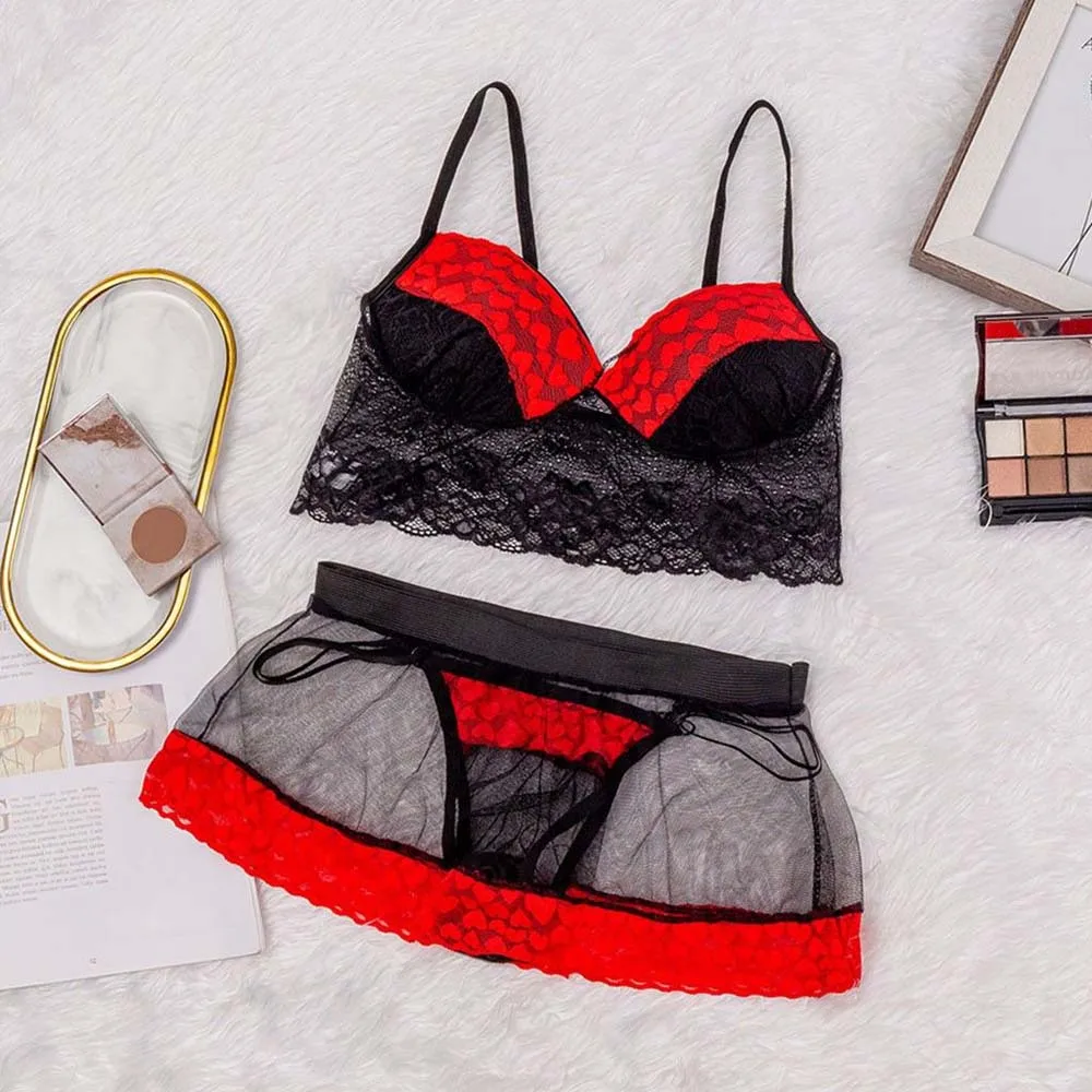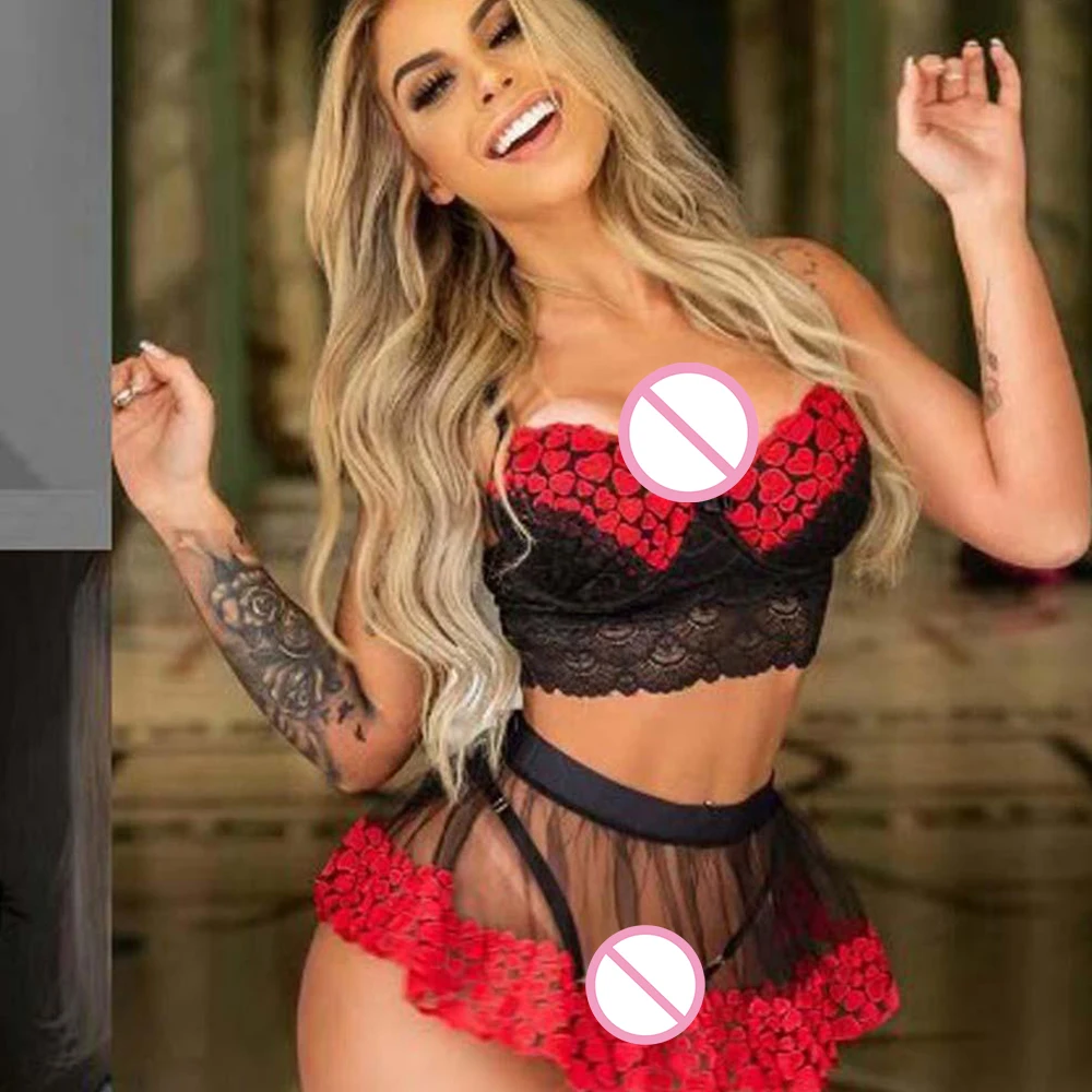 3 шт.компл. Женский комплект нижнего белья, кружевные прозрачные экзотические пижамные костюмы с цветочным рисунком, сексуальные укороченные топы, бюстгальтер + стринги + юбка, комплекты женской ночной одежды
