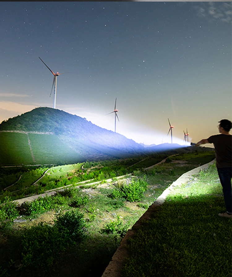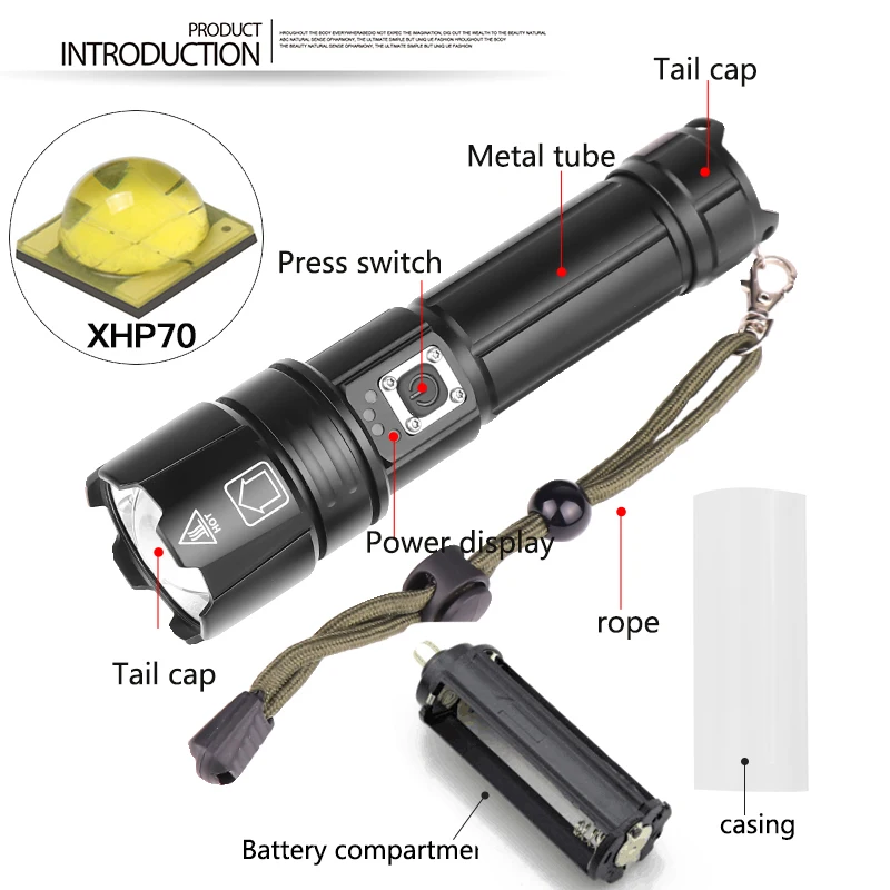 Мощный светодиодный фонарик с использованием XLamp XHP50 светодиодный фонарик с максимальным выходом до 50000 люменов Дисплей емкости аккумулятора, телескопический зум Микро-usb для компьютера usb, Автомобильный USB, usb-разъем для зарядки, зарядный фонарик Изготовлен из авиационного алюминиевого сплава прочный HAIII военный класс Жесткий анодированный Водонепроницаемый в соответствии с IPX-6, водостойкий, может использоваться в дождливую погоду, но не может положить его в воду Подходит для работы, охоты, альпинизма, рыбалки, кемпинга и активного отдыха и т. д. Ударопрочный до 2 метров