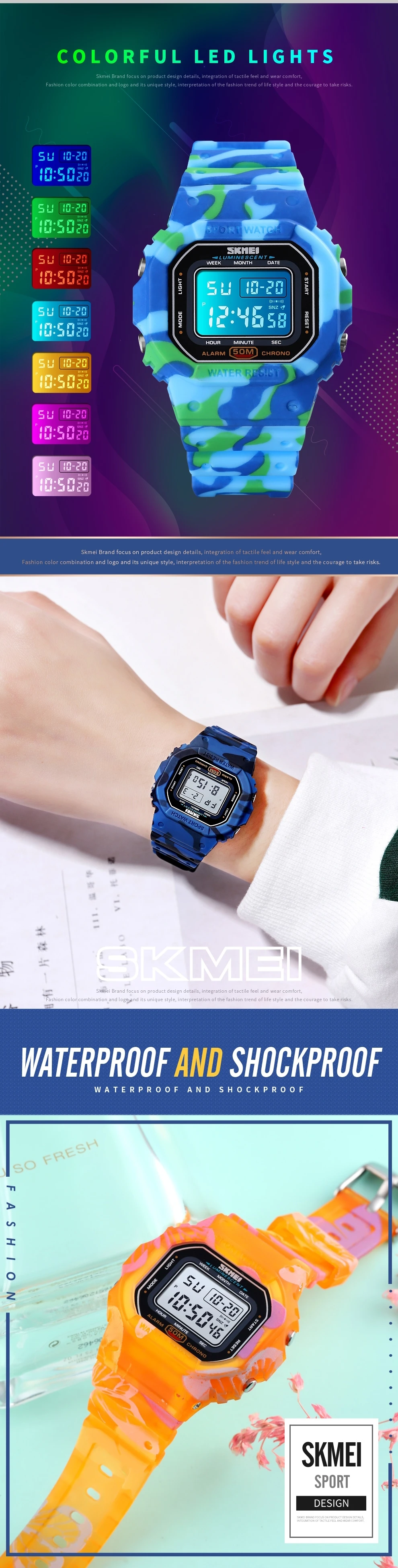 SKMEI модные красочные светодиодные спортивные цифровые часы женские водонепроницаемые ударопрочный Секундомер Будильник повседневные часы reloj hombre