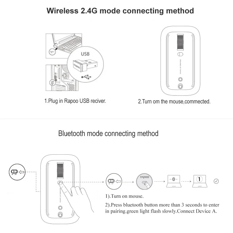 Как подключить по 2,4G и Bluetooth?2,4G:1. Подключите приемник Rapoo.2. Включите мышь.3. Готово.Bluetooth 3,0 и 4,0:1. Включите питание2. Нажмите кнопку Bluetooth три секунды, чтобы начать сопряжение, зеленая вспышка, подключите bluetooth A.1. Короткое нажатие кнопки Bluetooth для переключения устройства.2. Нажмите кнопку Bluetooth три секунды, чтобы начать сопряжение, синяя медленная вспышка, подключение bluetooth B.