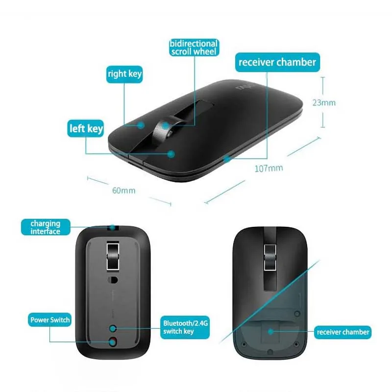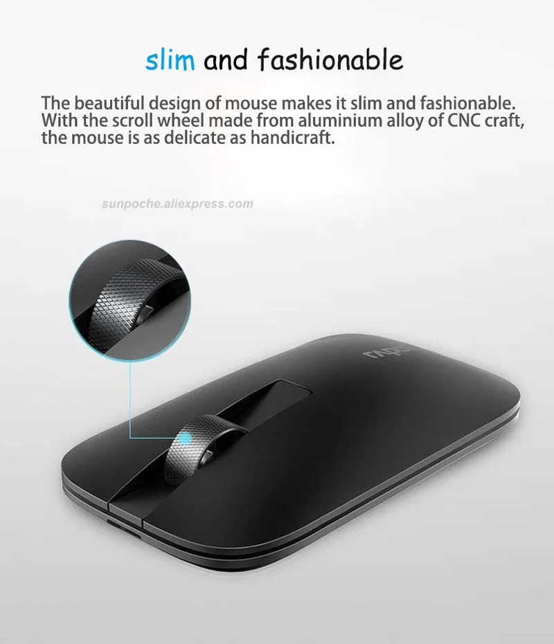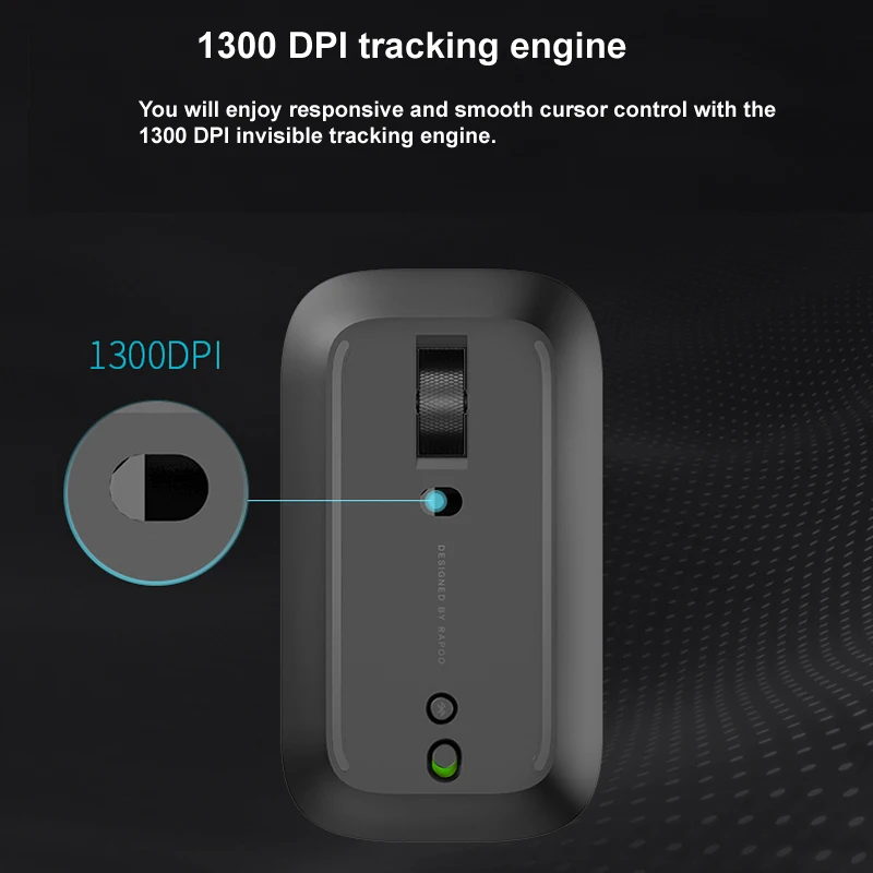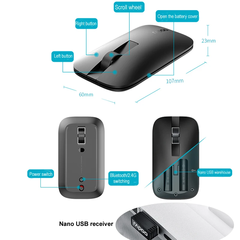 1. Переключение между Bluetooth 3,0, 4,0 и 2,4GУмный переключатель между Bluetooth 3,0, 4,0 и 2,4G обеспечивает стабильную беспроводную передачу данных. Вы все еще можете использовать мышь независимо от недостачи usb-порта или потери приемника.2. Умное переключение между несколькими устройствамиАвтоматическое Сопряжение рабочего устройства. Одновременно подключается к 3 устройствам и легко переключается между ними. Это упрощает сложную кросс-платформенную манёвру и отвечает требованиям многозадачности.3. Точность почти на каждой поверхностиВысокопроизводительный лазерный двигатель позволяет использовать мышь практически на любой поверхности. Наслаждайтесь высокой скоростью отклика и непревзойденной точностью.4,1300 точек/дюйм двигатель отслеживания высокой четкостиВы будете наслаждаться чувствительным и плавным управлением курсором с 1300 точек/дюйм высоким разрешением оптического отслеживания двигателя.Срок службы батареи 5,12 месяцевБлагодаря новейшей энергосберегающей технологии Rapoo и выключателю питания вы можете использовать мышь без прерывания питания до 12 месяцев.6. Бесшумная конструкцияЭто Беспроводная Бесшумная мышь, которая поможет вам создать тихую рабочую среду.7.CNC мастерство almuminum сплав колесо прокрутки.Посылка включает в себя:1X Rapoo мультирежимная беспроводная мышь1X Приемник1X Руководство пользователяКак подключить по 2,4G и Bluetooth?2,4G:1. Подключите приемник Rapoo.2. Включите мышь.3. Готово.Внимание покупателя:1. Авторизованный магазин Rapoo, 100% оригинальные продукты Rapoo. Анти-поддельные марки доступны на стороне оригинальной упаковки, и вы можете проверить его на официальном сайте Rapoo: www.rapoo.com.2. Мы проверяем все наши продукты перед отправкой, чтобы гарантировать, что они работают хорошо.3. Батарея не входит в комплект, для безопасной транспортировки, Мы вынем батарею.