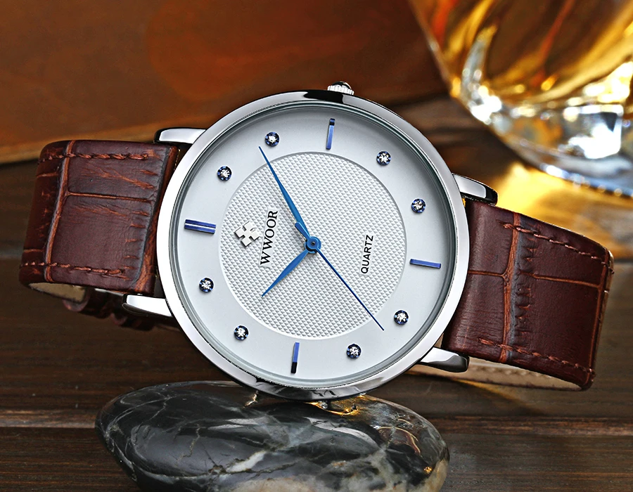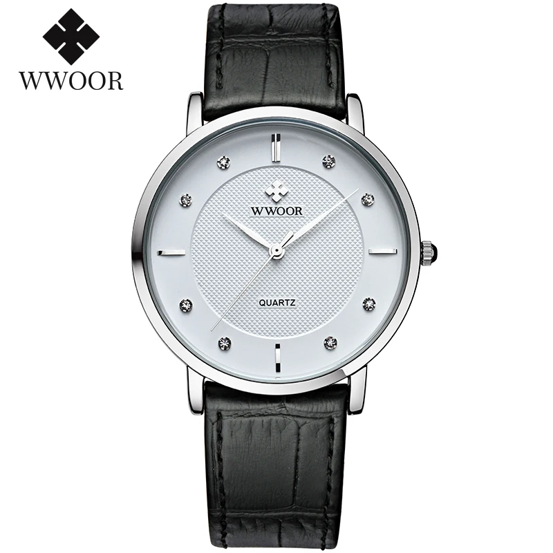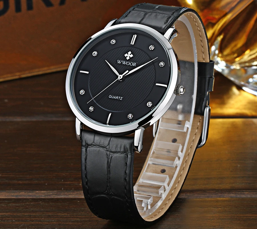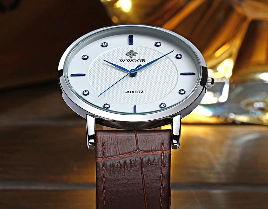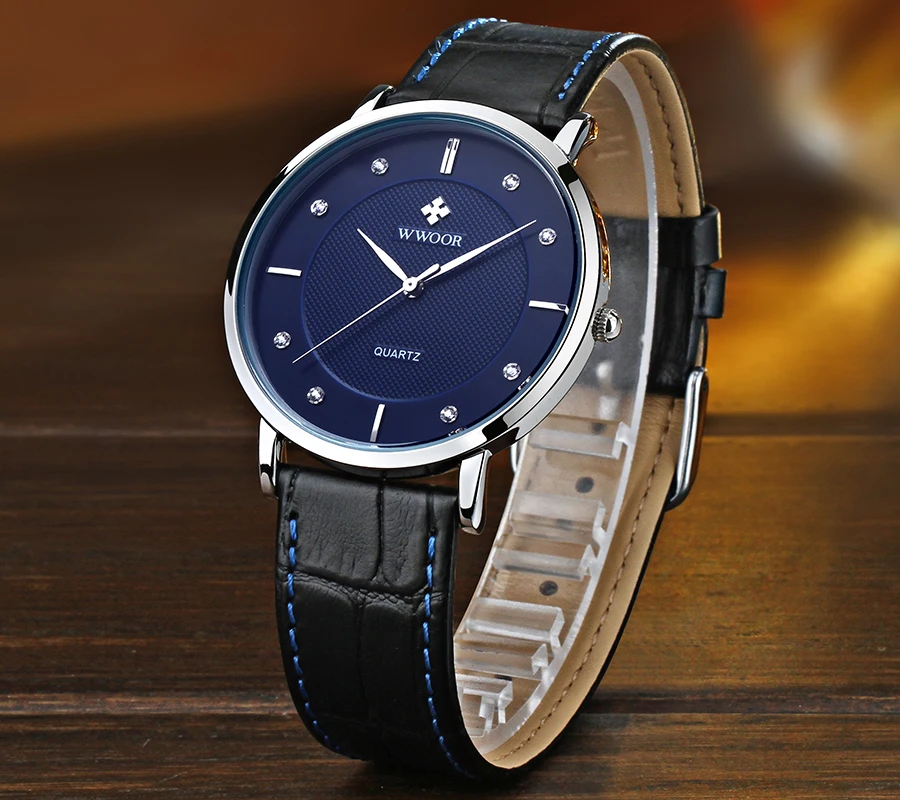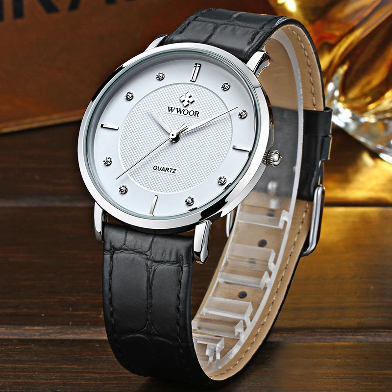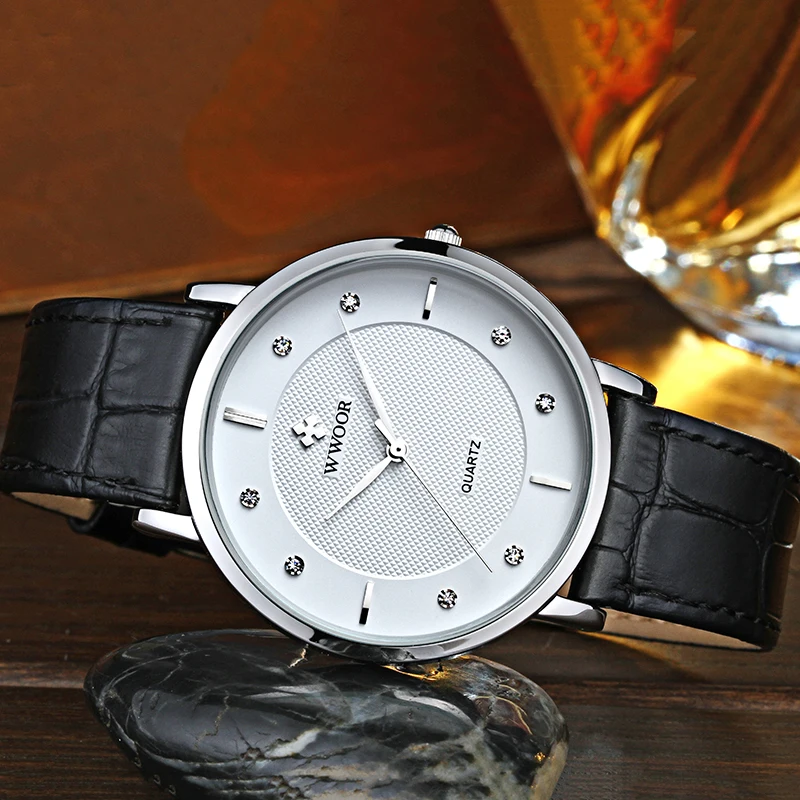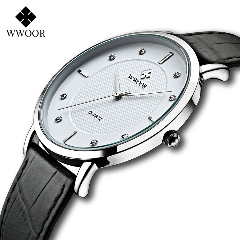 Часы наручные WWOOR Мужские кварцевые ультра тонкие, брендовые Роскошные водонепроницаемые, с кожаным ремешком