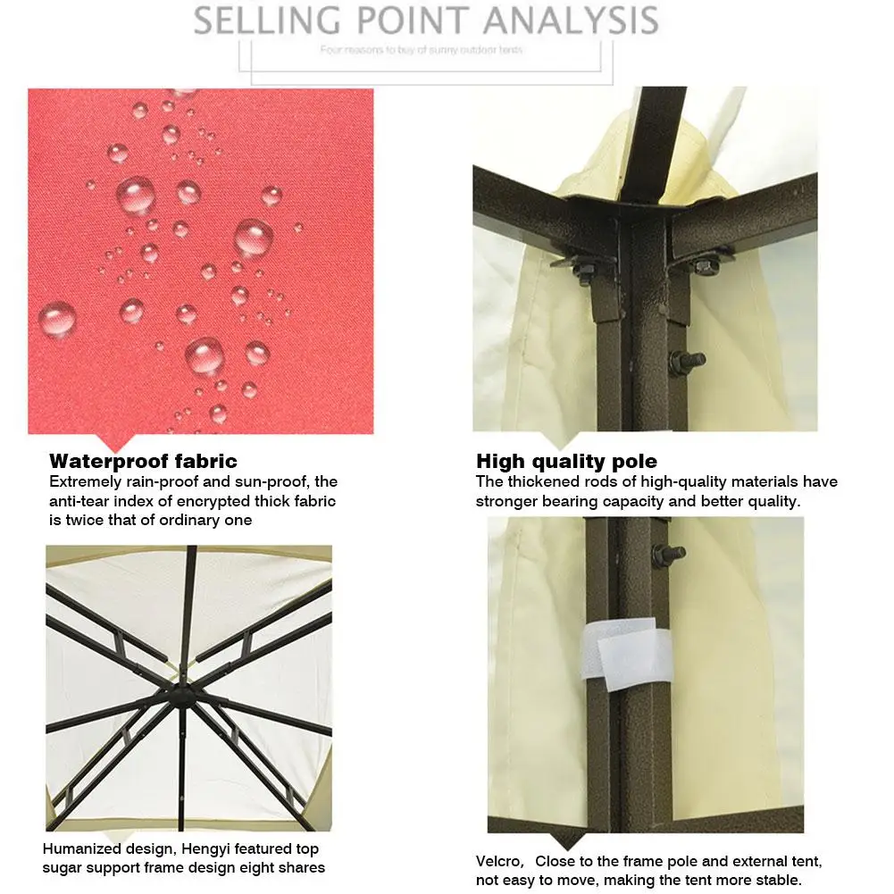 1. Размер изделия: верхняя крышка палатки составляет около 10 'x W10' с алюминиевым отверстием в szie.2. Легко заменить: верхняя крышка на раме беседки легко заменить и очень удобно использовать.3. Материал полиэстер: Изготовлен из полиэстера, верхняя крышка беседки долговечна в использовании.4. Блок УФ-лучей: верхняя крышка беседки может блокировать до 95% УФ-лучей солнца.5. Идеальные случаи: верхняя крышка беседки идеально подходит для отдыха вечерние, барбекю и коммерческого использования.