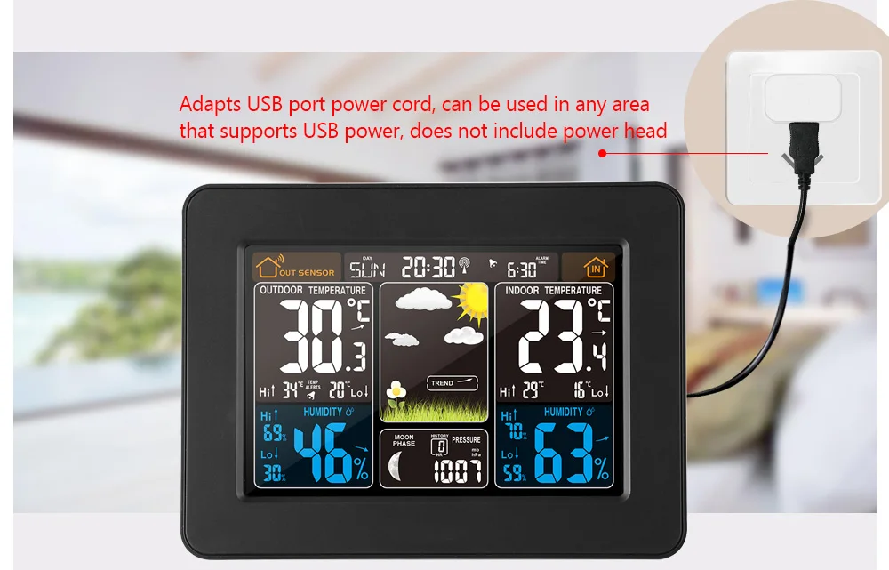 4. Температура и влажность в помещении/на улице (°C или °F). Диапазон измерения температуры в помещении: -10 ℃ ~ 50 ℃, Диапазон измерения температуры вне помещения: -20 ℃ ~ 50 ℃, диапазон измерения влажности в помещении и на улице: 20% RH ~ 95% RH.