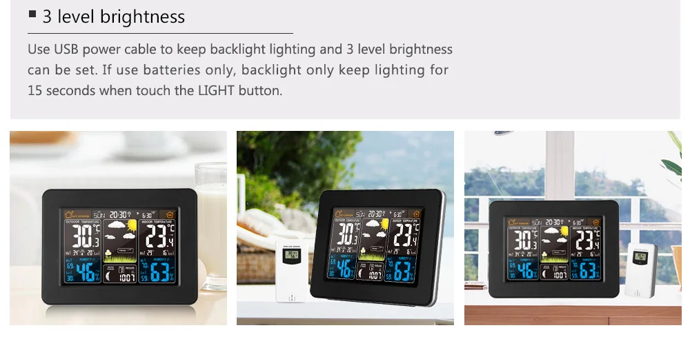 3. Зарядное устройство USB для электронных устройств. Когда адаптер питания подключен, подсветка сохранит свет и нажмите кнопку повтора для выбора 3 уровня подсветки. При использовании только батареек подсветка сохранит свет всего 15 секунд, нажав кнопку повтора сигнала, дисплей может быть плохо виден без подсветки.