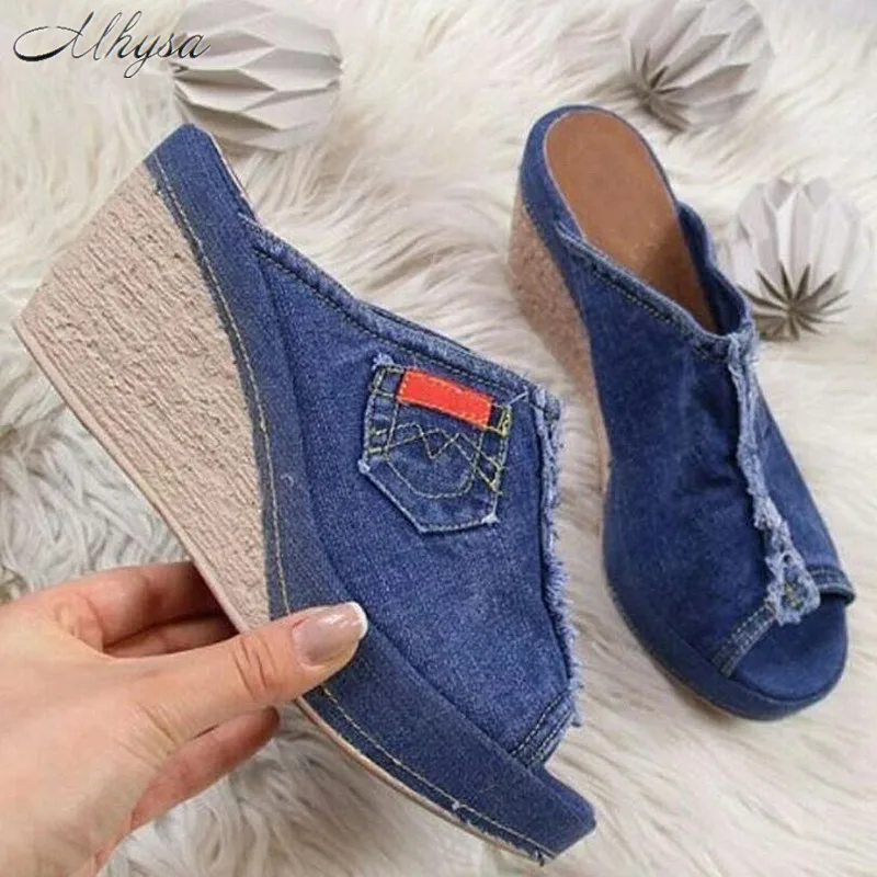 Женские джинсовые шлепанцы на платформе, туфли из денима на танкетке с носком, большие размеры 35-43, новинка 2020