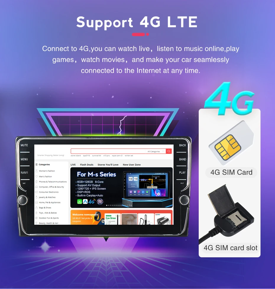 > Поддержка 4G Lte, вставьте карту 4G, вы можете смотреть в реальном времени, слушать msuci онлайн, смотреть фильмы, И сделать ваш автомобиль легко подключен к Интернету в любое время (только для K9863C-K7862C)