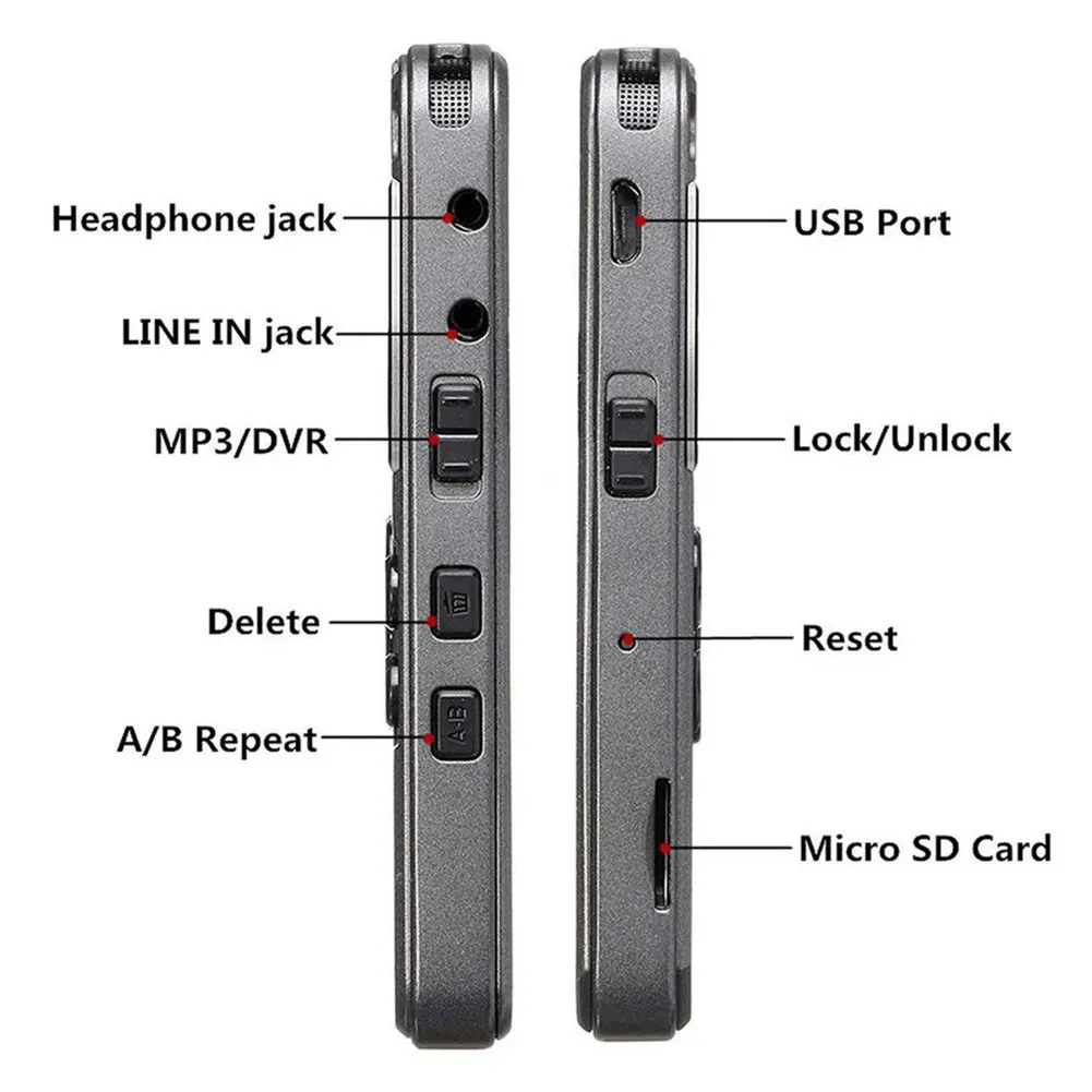 1. Корпус изготовлен из цинкового сплава и устойчив к падению 2. Профессиональный Чип ручки ATJ2129, линейная Запись HD без потерь 3. Поддержка английского/китайского/русского/корейского/японского (24 языка) 4. Отметка времени, автоматически назначает файлы записи по дате 5. Начните запись и включите питание в установленное время 6. Особенности: диктофон, MP3, мобильный HD 7. Функция шумоподавления AGC, автоматическая Настройка источника шума 8. Мониторинг записи в режиме реального времени/функция слухового аппарата 9. Функция воспроизведения: Поддержка циклической записи, A-B повтора 10. Защита паролем 11. Поддержка проверки оставшегося времени записи 12. Поддержка памяти расширения до 64 Гб с TF-картой 13. Встроенные высококачественные динамики с прямым внешним звуком 14. Без глаз светодиодный ная подсветка 15. Функция записи с голосовой активацией 16. Обнаружение низкого заряда батареи и автоматическое Сохранение текущего файла записи перед выключением питания. 17. Начните запись одним нажатием, Поддерживайте голосовую активацию и запись монитора 18. Встроенный литиевый аккумулятор, перезаряжаемый 19. Разъем USB 2,0, легко загружать и загружать файлы 20. Поддержка телефонной записи, запись по сегментам автоматически во время вызова 21. Цвет: серый/черный