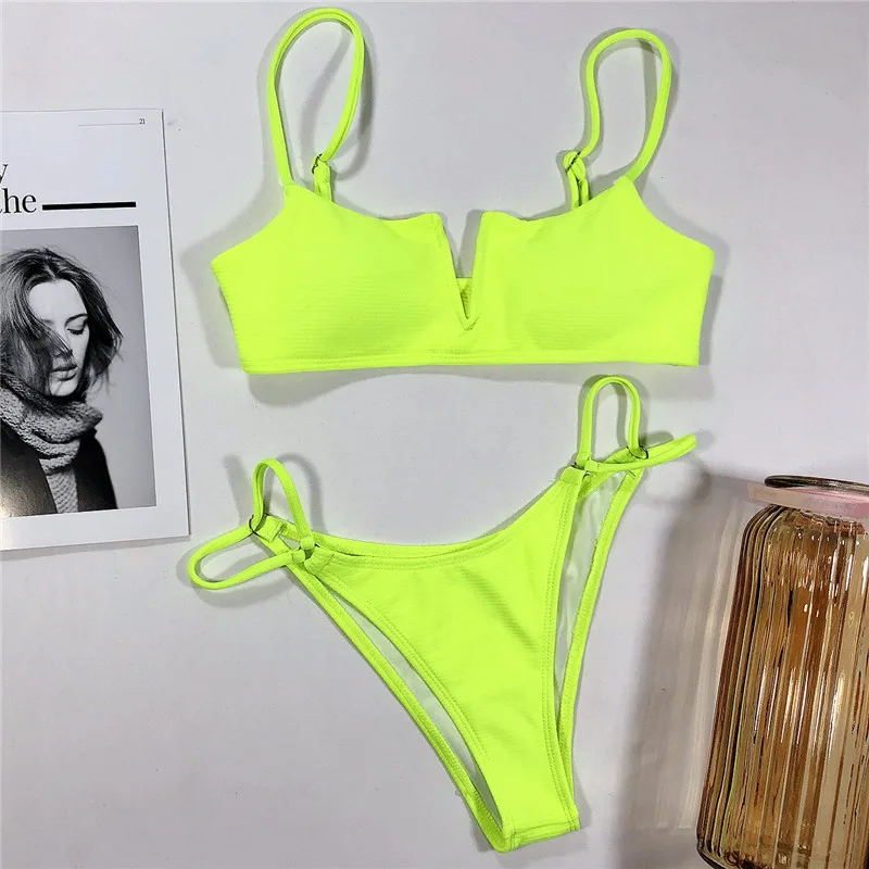 Сексуальный неоново-зеленый комплект бикини, Женский однотонный куп...
