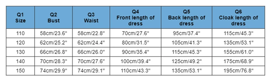 Наше платье принцессы для девочек очень красивое и высокое качество. Подкладка платья изготовлена из мягкого и удобного хлопка. Все AngelGirl платья 100% Новый бренд и проверены перед размещением заказа выберите способ доставки DHL или EMS. Мы настаиваем на предоставлении вам высококачественной продукции и лучшего обслуживания клиентов. Закажите сейчас с уверенностью!Качественная ткань-удобный хлопок, вы можете выбрать размер в соответствии с размером ребенка.Q1 = размерQ2 = бюстQ3 = ТалияQ4 = длина спереди платьяQ5 = длина спины платьяQ6 = Длина плаща платья