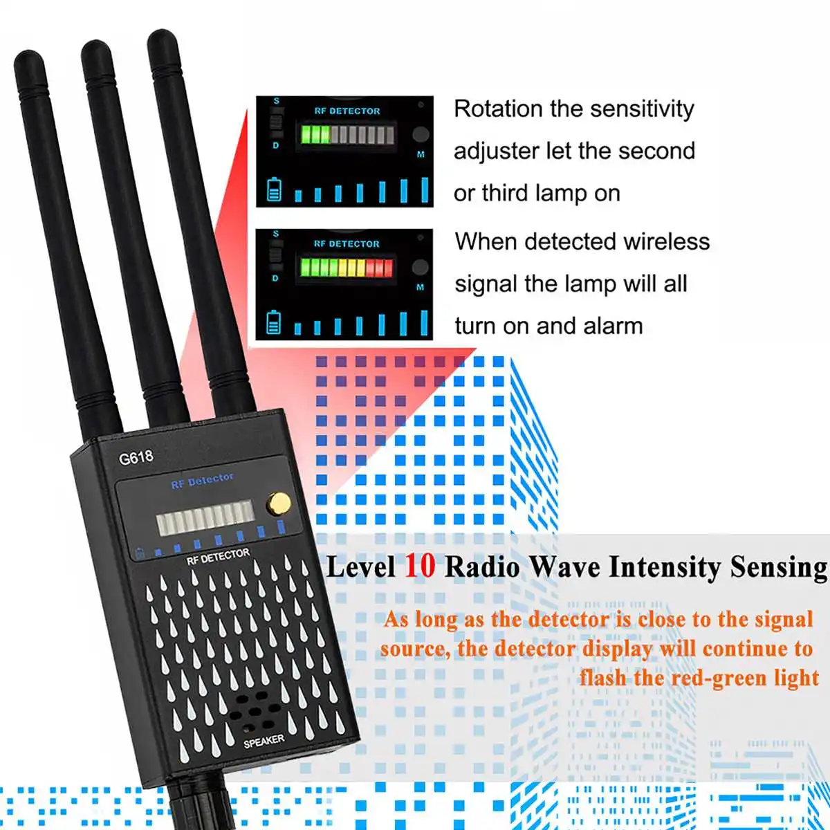 Особенности:-Профессиональное устройство радиообнаружения с высокой чувствительностью, регулируемым порогом и большим диапазоном обнаружения частоты-Прост в использовании (только переключатель + ручка чувствительности), звуковой и светильник вой индикатор сигнализации, точный и надежный-Может обнаруживать уязвимости и локаторы карт мобильной, Unicom, Telecom, 2G.3G.4G-Может обнаруживать высокоскоростную загрузку GPS-локатора пакетов-Может обнаруживать беспроводную камеру 1,2G/2,4G-Может обнаруживать беспроводную камеру 5,8 ГГц и беспроводное подслушивание-Может встретиться с военным/полицейским наблюдением. Он может обнаружить Электрический источник, так что предотвратит Вас и Вашу семью от повреждения электромагнитного излучения.