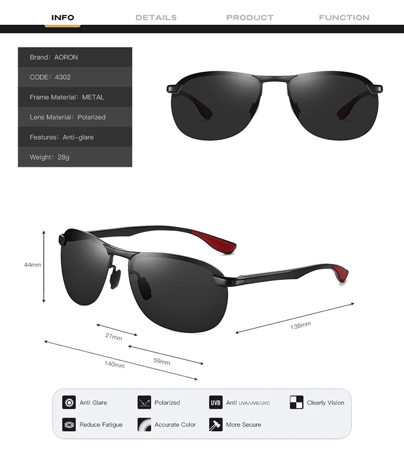 100% Фирменная Новинка и высокое качество. Материал линз: поляризованные линзы TAC Материал оправы: алюминиевая рама Видимая перспектива: 99 (%). Уровень защиты от ультрафиолета: 100% защита от ультрафиолета UV400. Поляризация: поляризованные очки. Вес: около 28 г. Ширина линз: около 59 мм. Высота линз: около 44 мм Ширина моста: около 21 мм. Ширина оправы: около 140 мм. Длина ножек: около 138 мм.