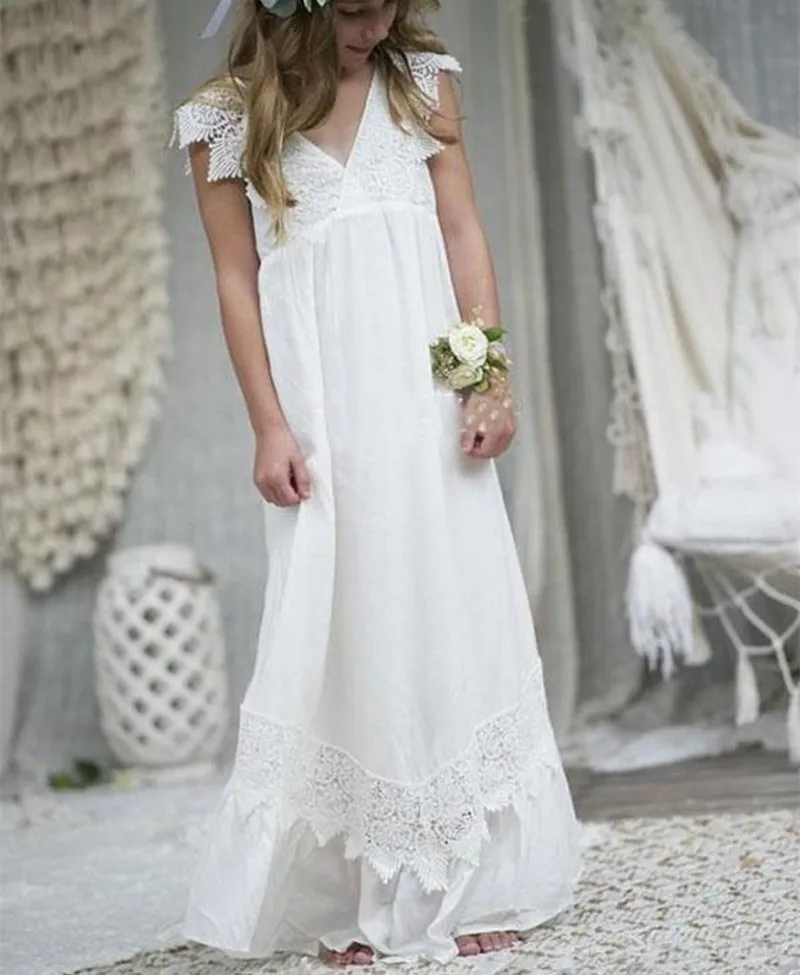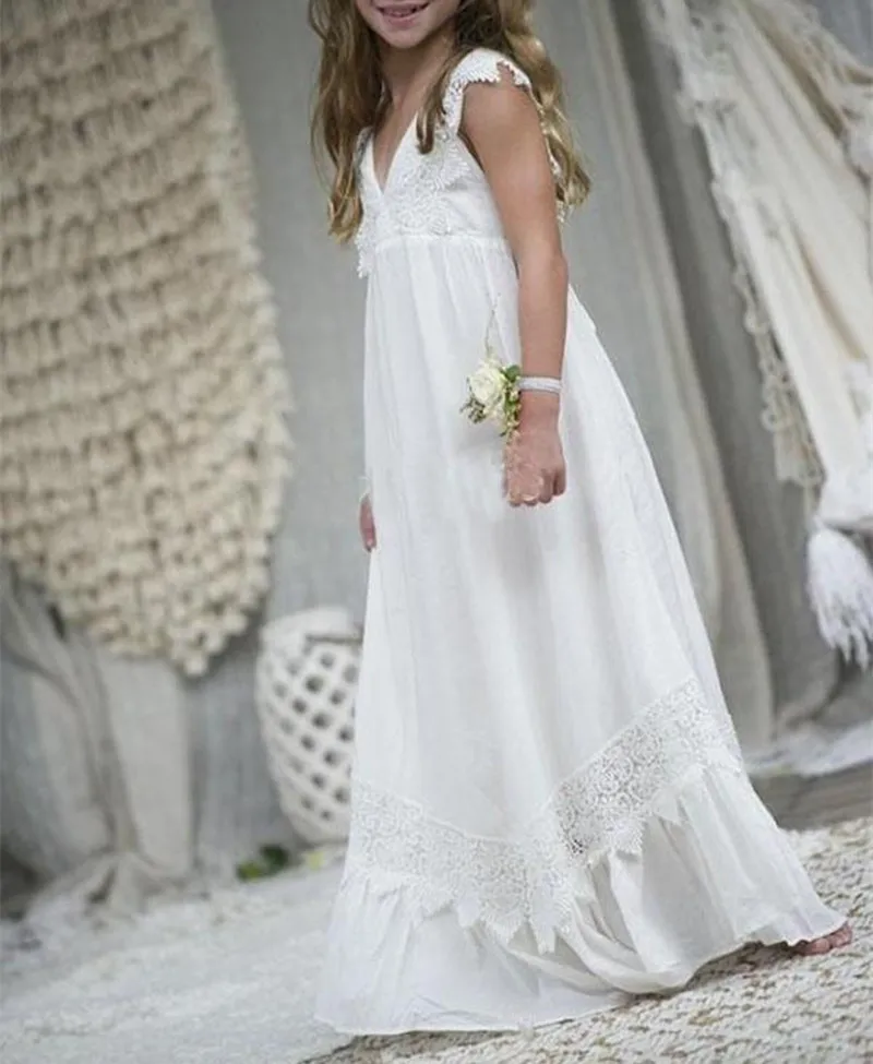 Пляжное платье в стиле бохо с цветочным принтом для девочек, свадебные шифоновые кружевные вечерние наряды на заказ, Детские официальные платья с V-образным вырезом для причастия