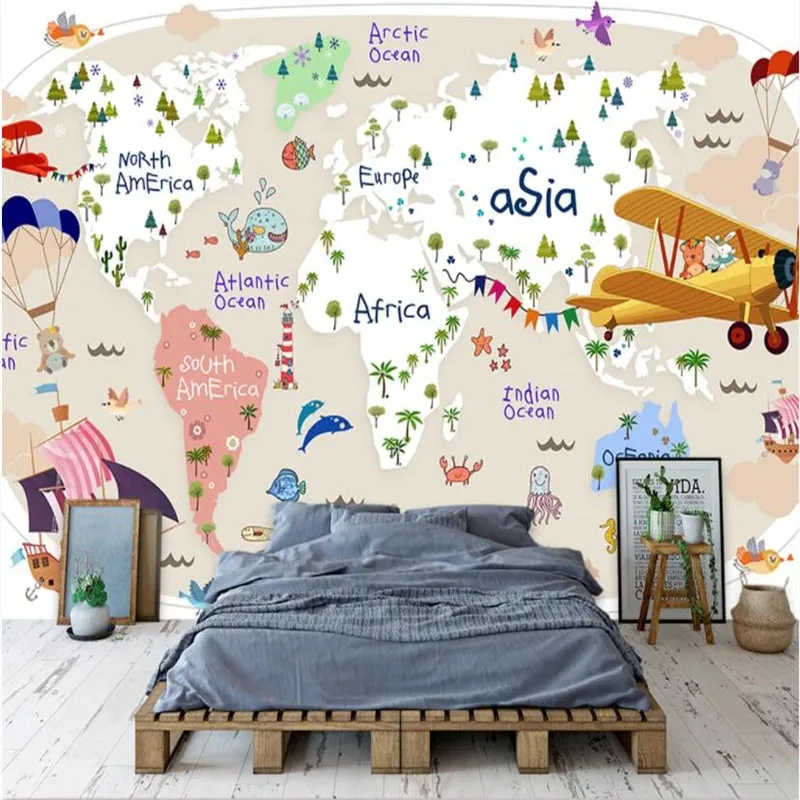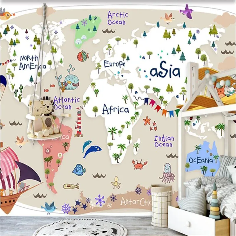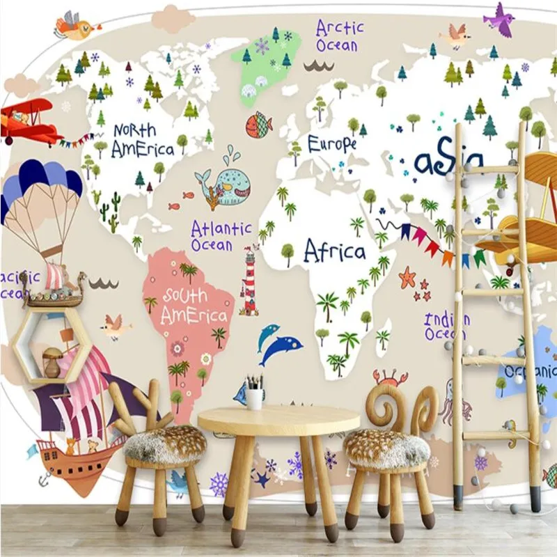 Индивидуальные Настенные обои на заказ для детской комнаты, мультяшная карта мира, детская комната, фон, Настенная бумага, домашний декор, 3D настенные фрески
