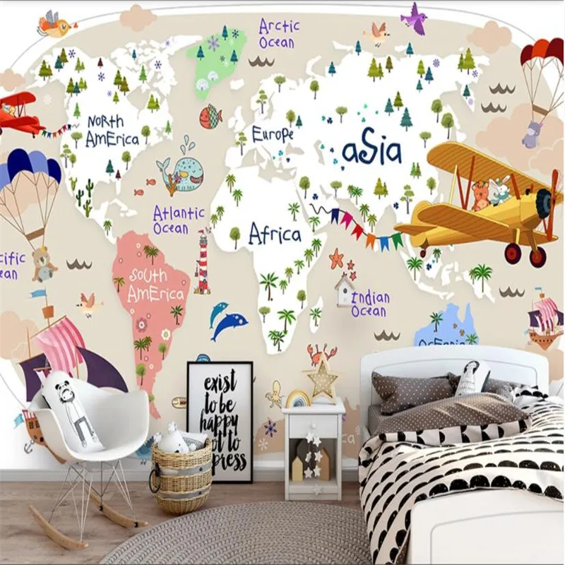 Настенная роспись в скандинавском стиле, 3D Мультяшные животные, самолёт, Карта мира, фоновые обои для детской комнаты, 3D обои, домашний декор