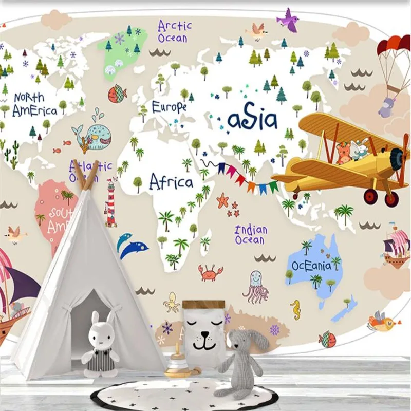 Настенные обои в скандинавском стиле для детской комнаты, 3D Мультяшные животные, самолет, Карта мира, фон для детской комнаты, 3D обои, домашний декор