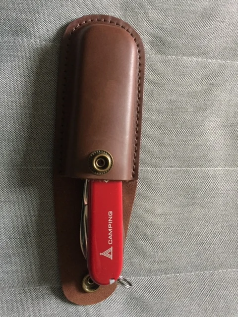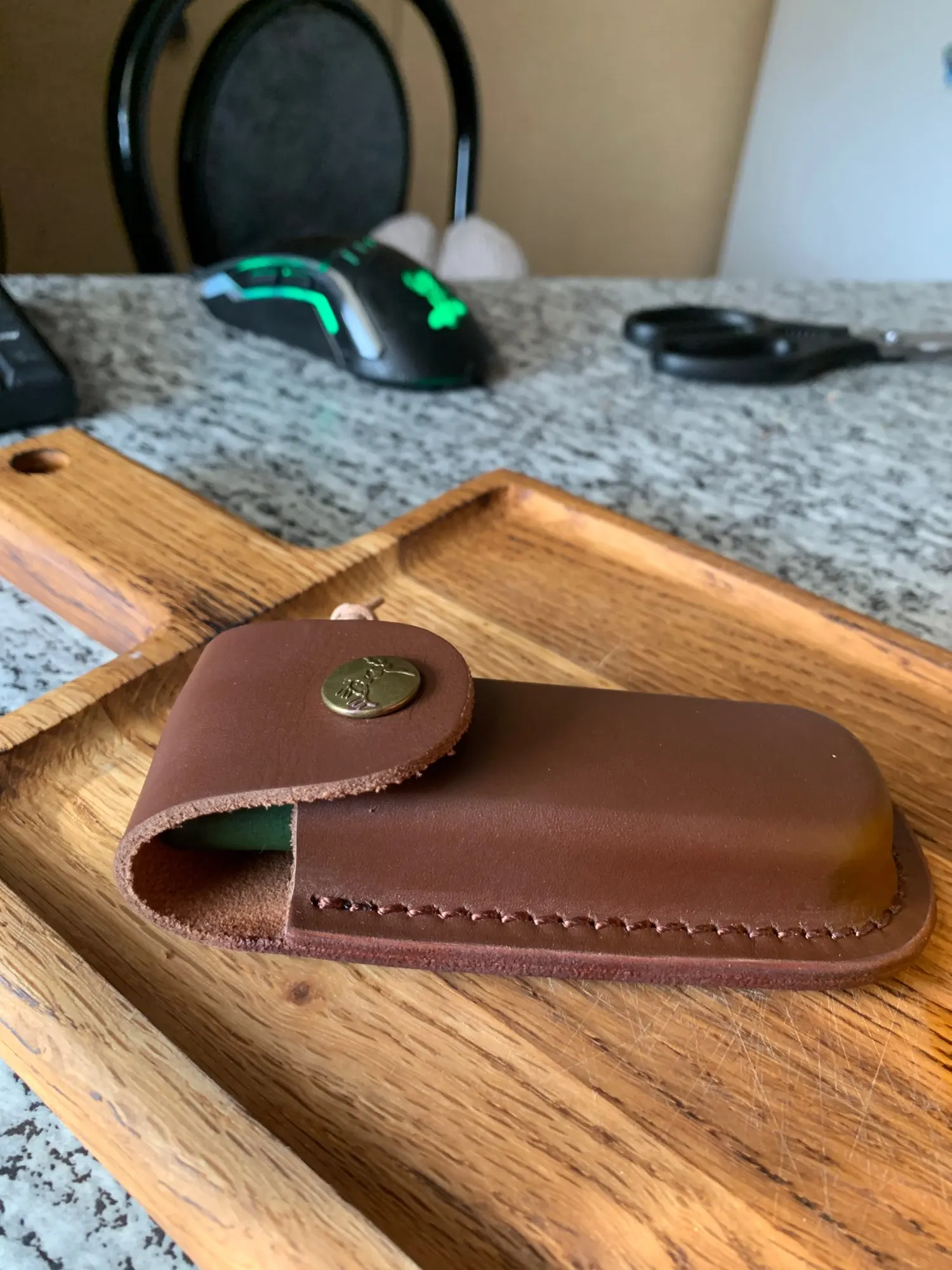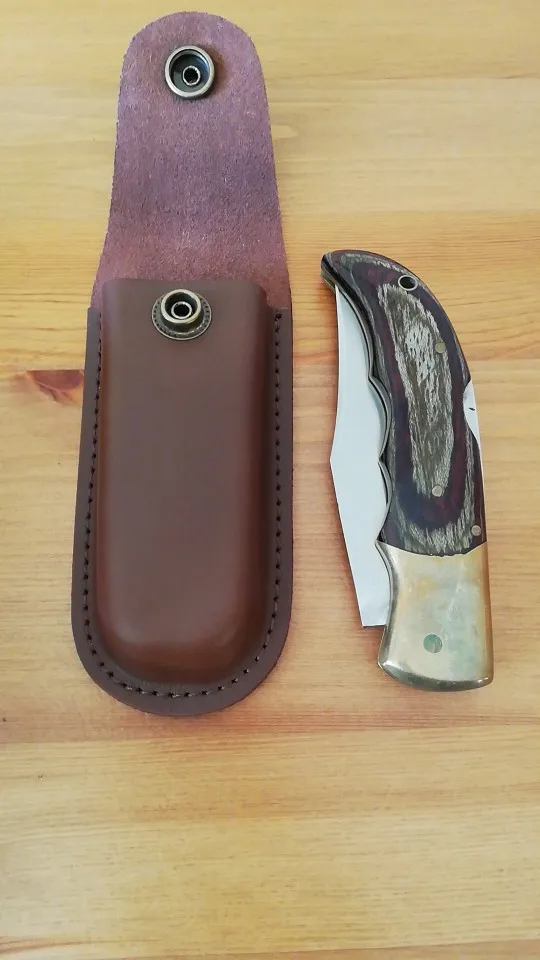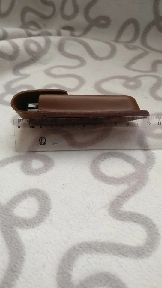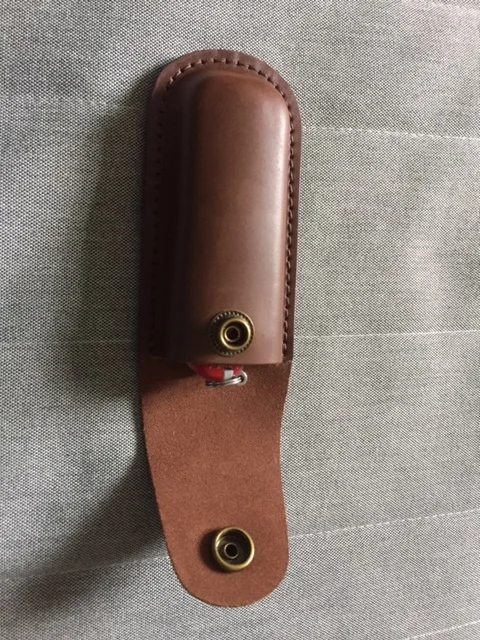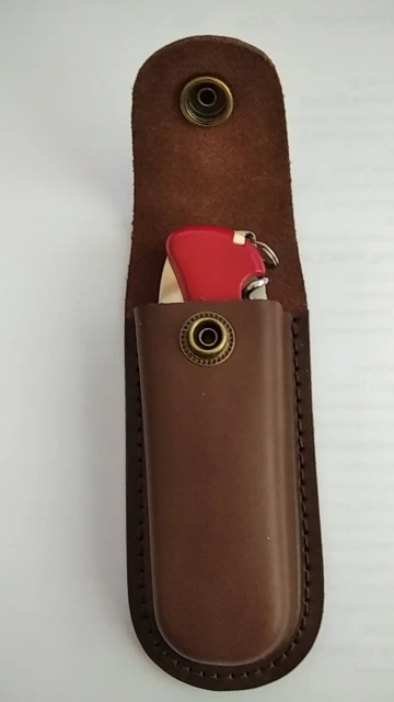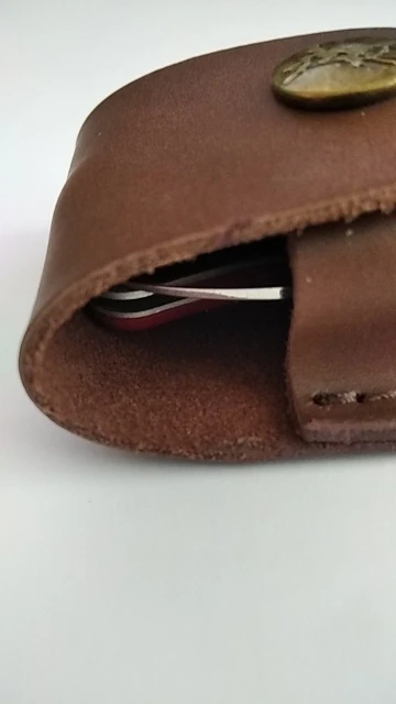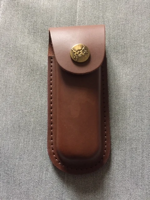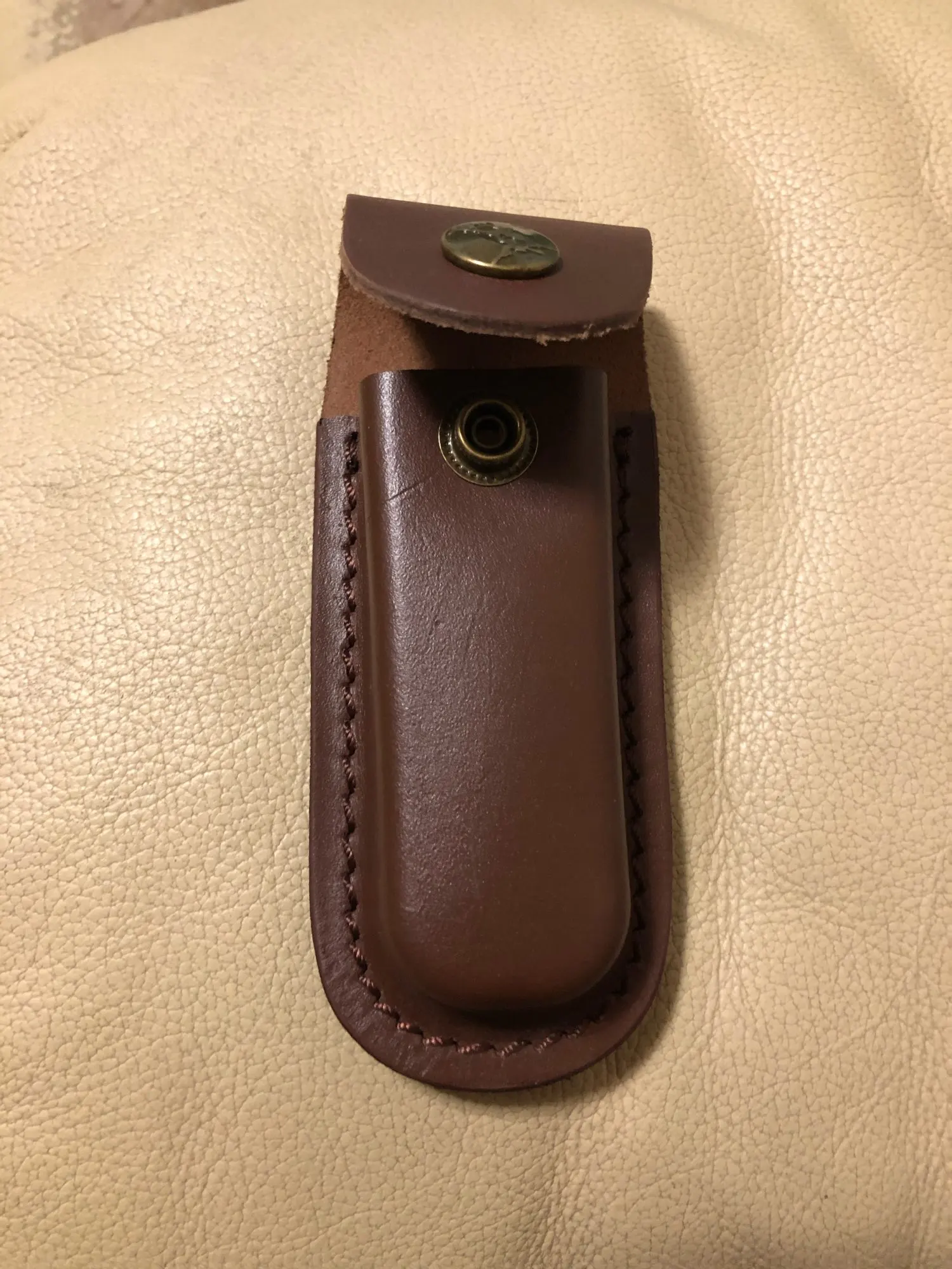 Покупал для мультитул Leatherman. Подошел хорошо, по обхвату - входит и выходит легко, по длине чехол длиннее на 1 см. Кожа гладкая, толстая, есть небольшой запах. Кнопка сильная.