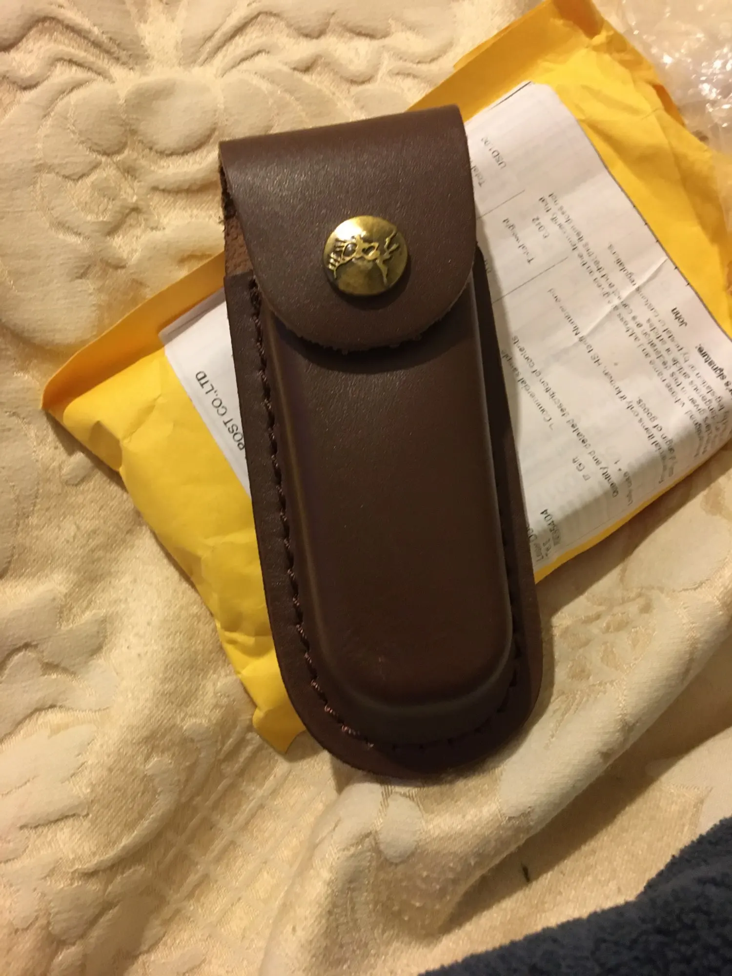 Ножны действительно кожа, по цене не ожидал. Берите не пожалеете. Трек отслеживался на всё пути, доставка раньше обозначенной даты. Продавцу респект