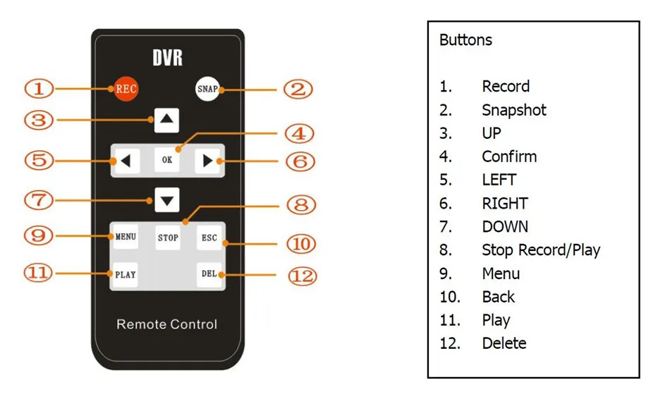 1. Вход питания: DC10V-35V 2. Интерфейс управления кнопками 3. USB: u-диск для хранения, мобильный жесткий диск для хранения Предупреждение: Не подключайте видеорегистратор USB _ 5 в к мобильному жесткому диску) 4. Хранение sd-карт 5. ИК: инфракрасный пульт дистанционного управления прием 6. Выход дисплея HDMI 7. CVBS/AHD: видео вход и выход 8. Серийное общение