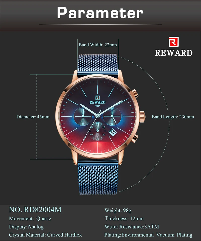 Материал корпуса: высококачественный сплав Чехол Диаметр: 45 мм Чехол Толщина: 12 мм Материал ремешка: нержавеющая сталь Длина ремешка (включая чехол): 220 мм Ширина ремешка: 23 мм Вес нетто: 98/58 г Механизм: оригинальный японский кварцевый механизм Водонепроницаемость 30 метров (поддержка купания и холодного душа)