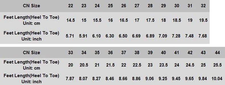 Примечание:1. Пожалуйста, выберите размер в соответствии с длиной стопы (от пятки до носка), и если у вас широкая стопа, пожалуйста, выберите на 1-2 размера больше.2. Если вы не уверены в таблице размеров, пожалуйста, сообщите нам длину вашей стопы. Мы можем порекомендовать размер.