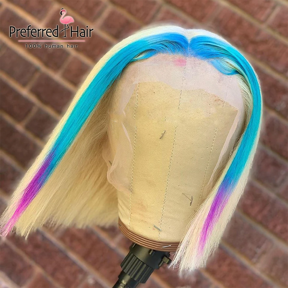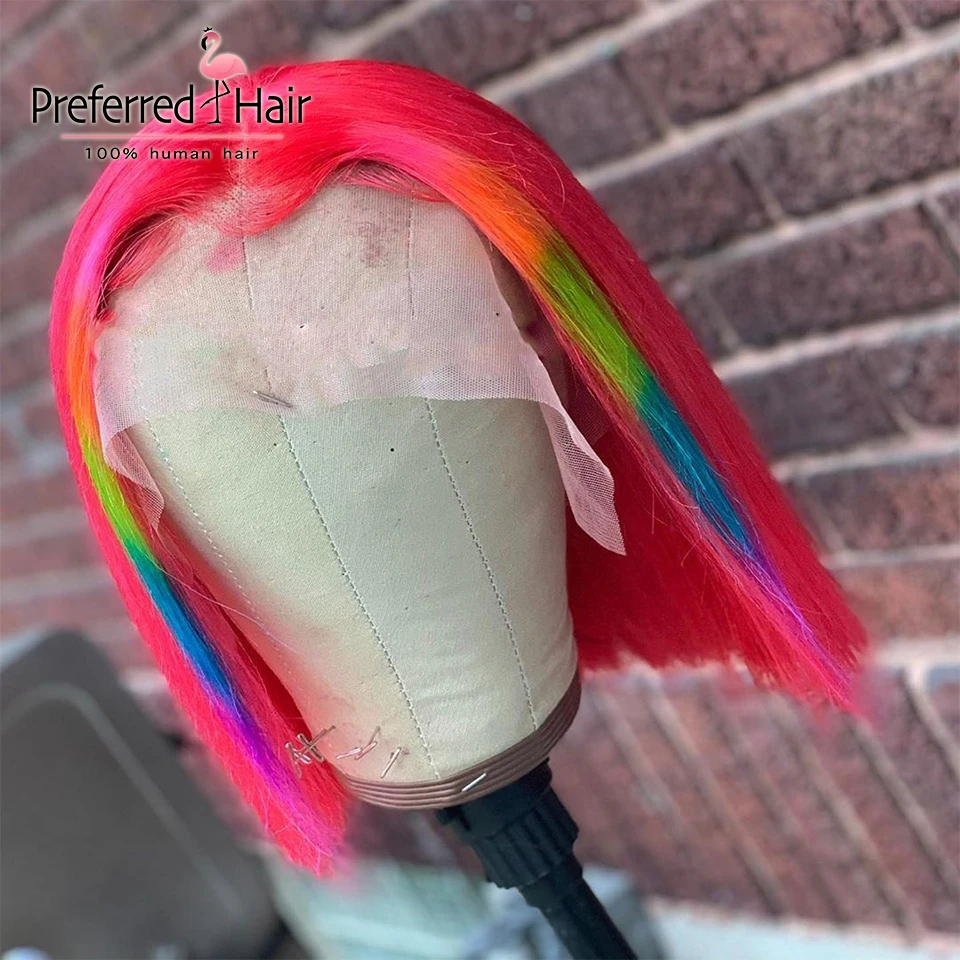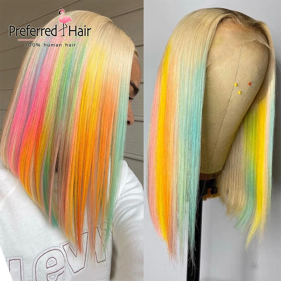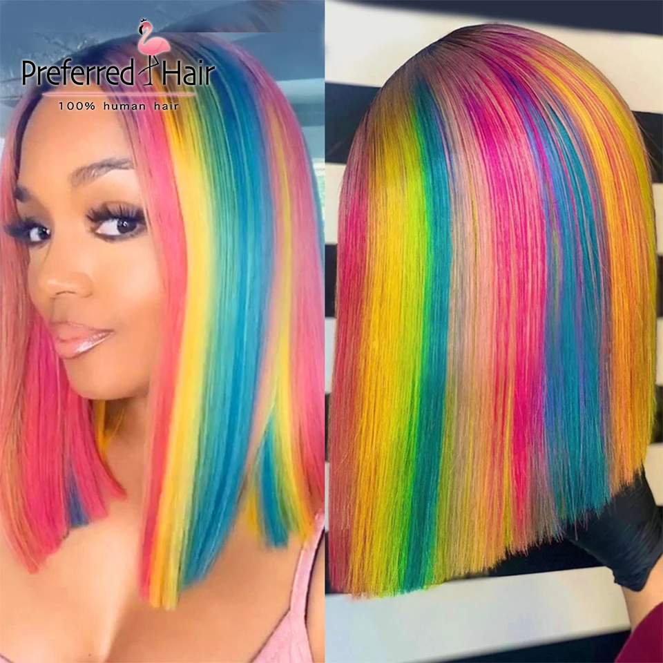 Предпочтительный парик Rainbow Bob, предварительно выщипанные переливающиеся парики из человеческих волос на шнурке