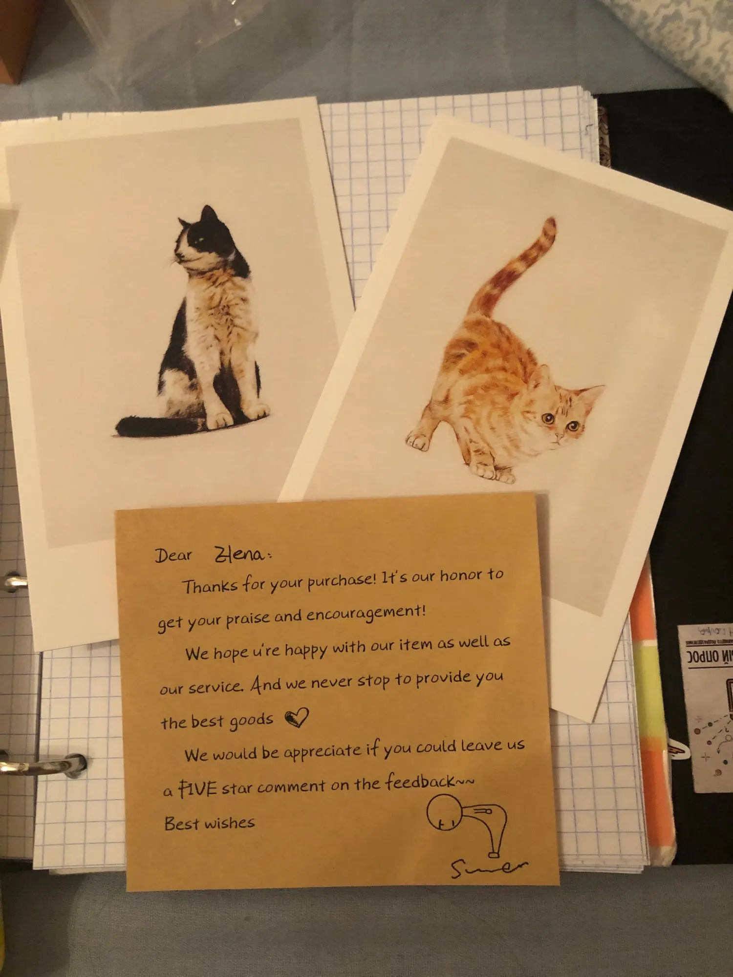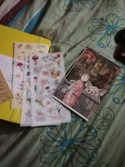 Посылка пришла очень быстро, приятные и плотные листы . Продавец положил в подарок милые наклейки и пару открыток ^_^