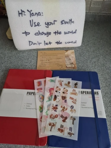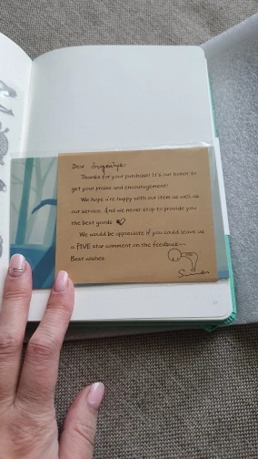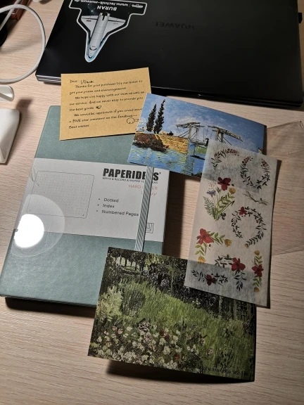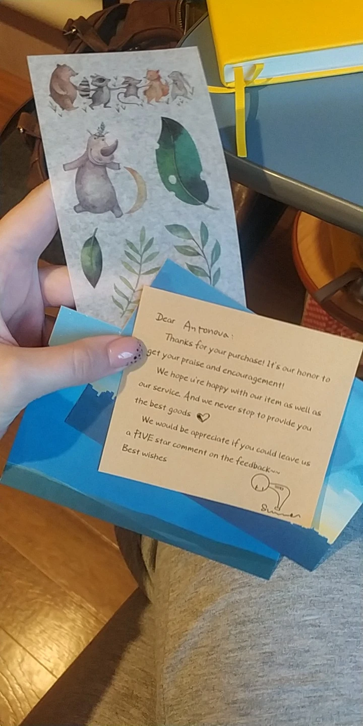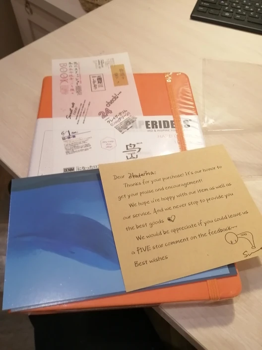 Мне понравился блокнот и бумага. Цвет красивый, не завидовать брендам moleskine или leuchtturm. Продавец отправил Подарочные наклейки и две открытки. В дополнение к размещению персонализированного сообщения. Я куплю еще больше цветов!