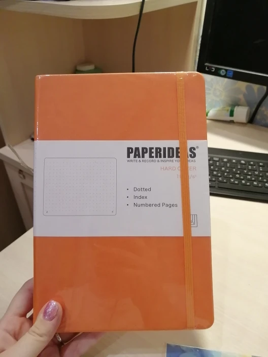 Отличный блокнот, приятная бумага, не слишком белая, имеет в начале разметку под содержание и две тканевых закладки. Также страницы пронумерованы. Также продавец приложил в подарок наклейки и пару открыток, что очень приятно. Очень рекомендую к покупке, особенно тем, кто ведет Bullet journal