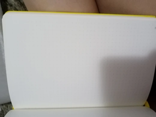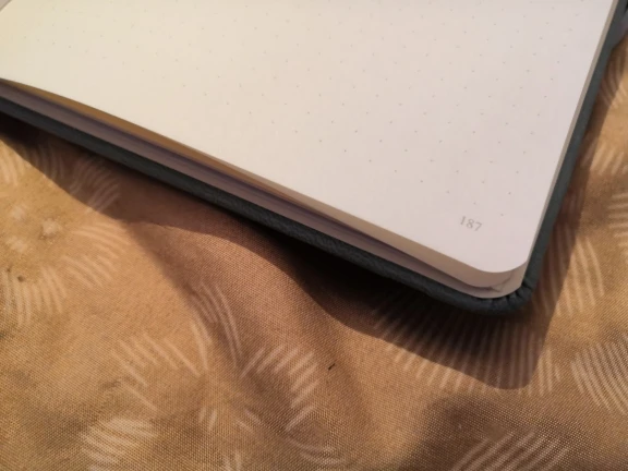 bought on 22nd February, arrived 5 March (before estimated time) beautiful colour, cover is nice and smooth, not as hard as i thought it would be and pages are nice and smooth, probably smoother than i'm used to. there is a slight smell but that's to be expected as it comes from a factory, and a little darkened mark on the top of the paper but it's basically nothing. dots and spacing are perfect, some pages also came a little crumpled in the middle, not sure how but it's also a small issue came with a sticker sheet and 2 postcards so happy with this, definitely recommend and will buy again!